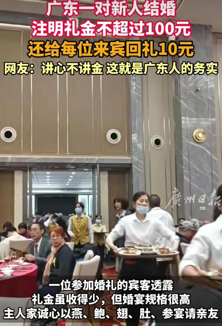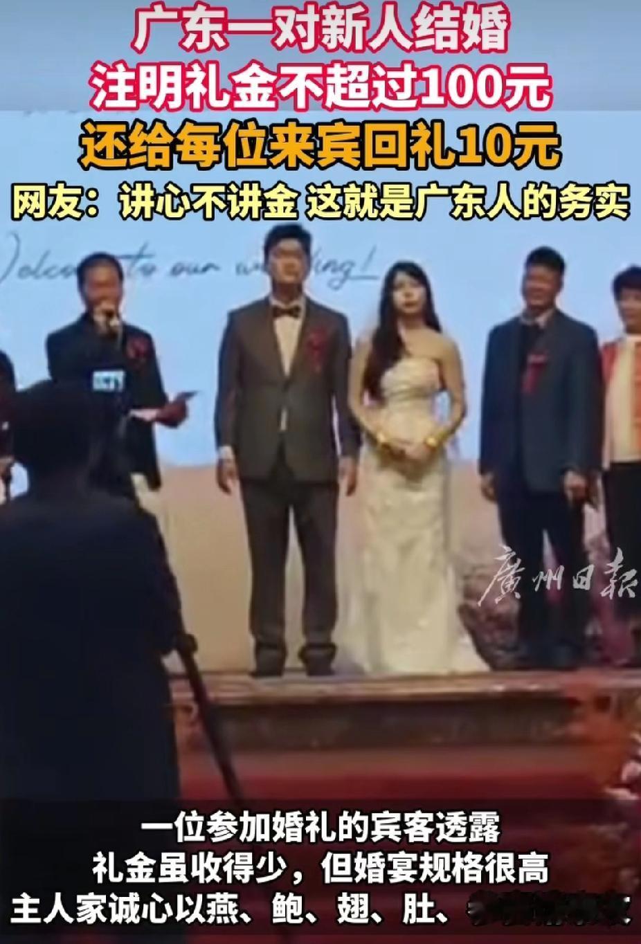 “太务实了!”广东中山,一对新人结婚,注明礼金不超过100元。没想到,还给每位来宾回礼10元。礼金收的虽低,但是婚宴规格高,有燕、鲍、翅、肚参等食物。 原来,主家在邀请宾客时,就已经特意注明礼金不超过100元。并且,主家还会按照当地习俗,给来参加婚礼的宾客回礼10元。 有去参加这场婚礼的宾客透露,婚宴规格高,食物也很丰盛。 而此事引发了网友们议论。 有网友说: 广东人务实,图个高兴,凑个热闹! 也有网友说: 我们广东人办事,别人到现场就是给我们面子了,不讲礼金的,来了就是对我们最大认可。 还有网友说: 收什么礼金,我村只收本房人和至亲的。本村的不是同一房人不收的,免费吃,每个小孩去吃酒席,都有10块钱的红包。 还有网友说: 这礼数好,值得提倡,按人数一人100,结婚的没压力,随礼的也没压力。 这对新人结婚,主家提前注明来礼金不超过100元,还回礼10元。 这意味着,如果你随礼100元,实际只需付出90元。而且婚宴上有高端菜式,整体规格相当丰盛。可见这一场看似“收得少”的婚礼,反而更显用心。 其实近年来,像是水涨船高的礼金常被吐槽,甚至有人因“红包负担”不敢参加婚礼,婚宴成为攀比舞台的背景下,这场婚礼犹如一股清流。 然而这家人主动给礼金设上限,同时又用高规格宴客,明显是把情谊放在了经济利益之上。他们是在告诉来的宾客: 你来,我就真心款待;礼金多少,真的不重要。 所以,从这场婚礼可以看出来,婚礼的本质: 不是敛财机会,也不是礼金簿上的数字比拼,同时人情往来不应成为负担,而应是轻松愉悦的祝福传递。而新人用这样的方式,首先减轻了亲友的压力,其次守住了自家的体面,最后更是传递出一个主家这边清晰的态度:那就是我们更珍惜你的到来,而不是你的红包。 最后,希望这样的婚礼新风尚能够传播开来,让更多的新人拥有勇气打破“礼金枷锁”,让婚礼回归庆祝与分享的本质。 毕竟,婚姻的幸福程度,从不该用礼金簿的厚度来衡量。 为这样的新风尚点赞——婚姻的起点是爱,婚礼的温度,也本该如此简单、温暖。 (来源: 广州日报)