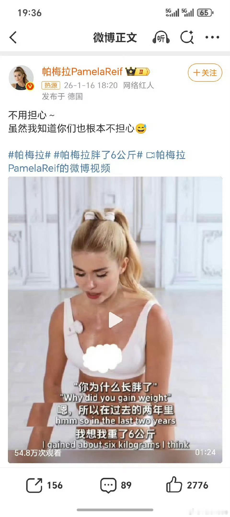 帕梅拉胖了6公斤以前我涨一点肉都会没法接受自己后来想明白了吃吃减减才是常态!而且