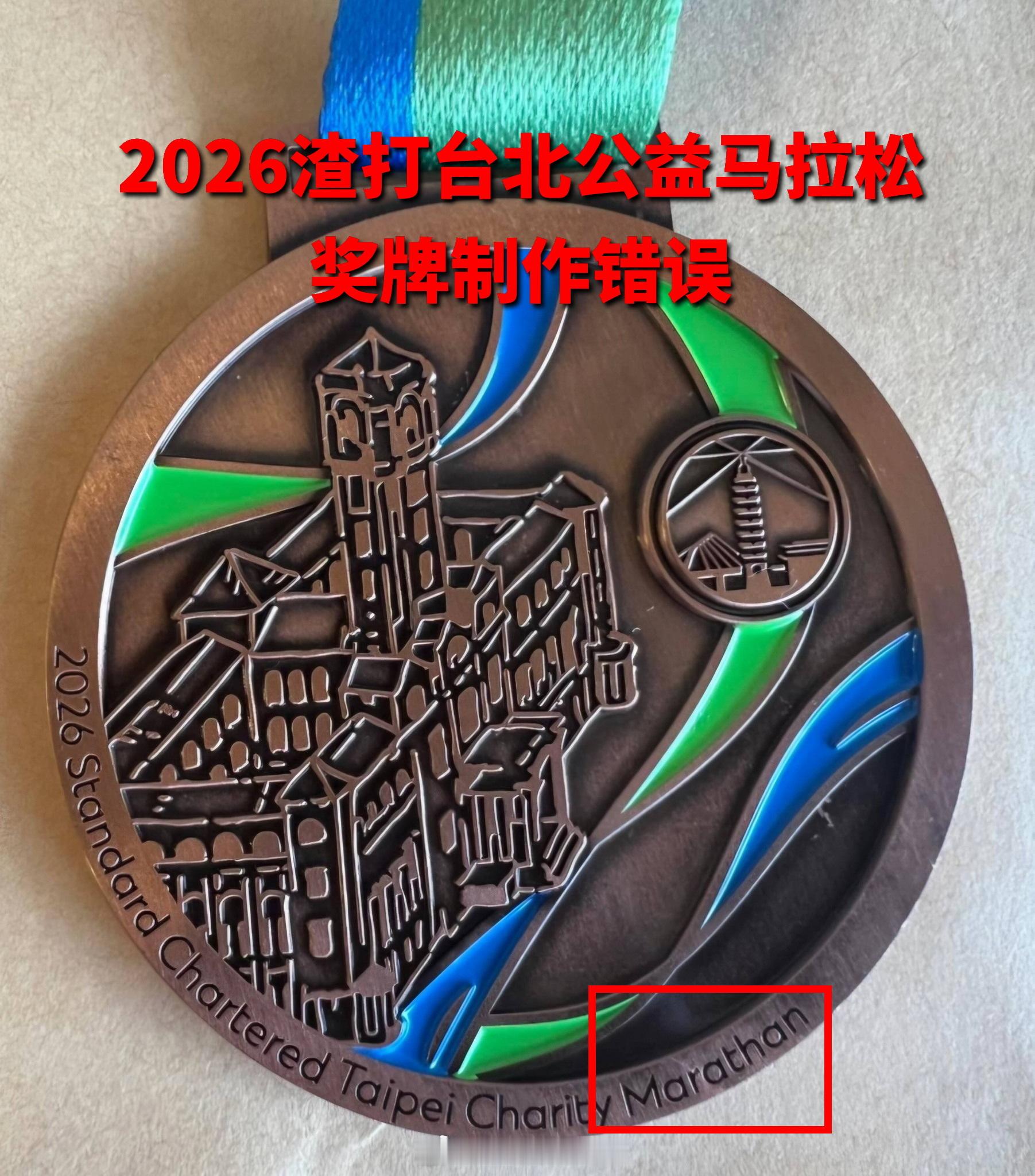 2026渣打台北公益马拉松奖牌由于制作错误(全组别“马拉松”英文误为 Marathan),组委会做出补偿:-向全部跑者补寄正确奖牌,包含海外跑者。-如现场进行了刻字服务,提交照片后组委会将原样刻字再进行寄送。不惜成本挽回声誉跑步 奖牌设计 赛事组织