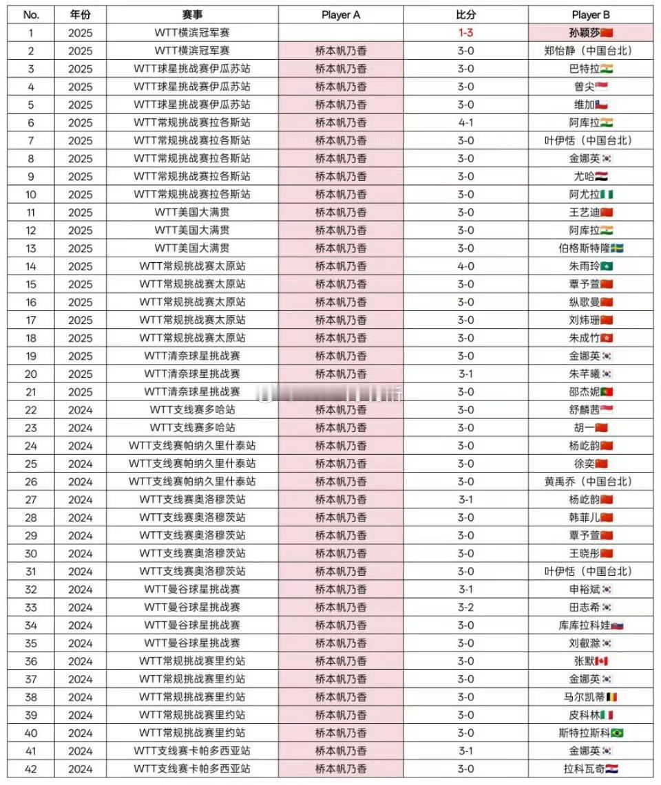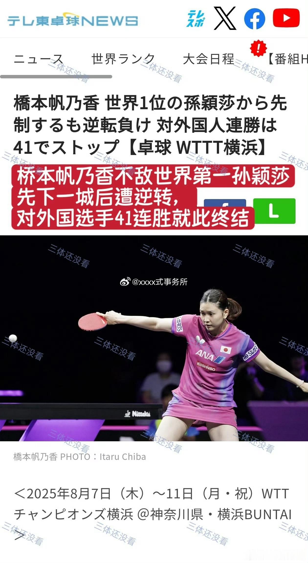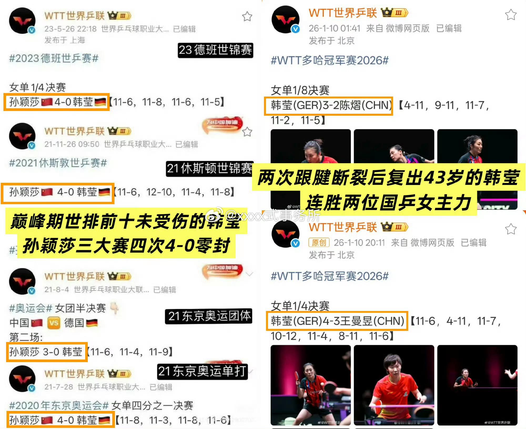 国乒2026开年两站比赛已经有三位主力输削球了,至此女队除了孙颖莎均败给过削球手,正常来说过不了削球关当不了主力队员,原来这些年削球手都是孙颖莎在打孙颖莎三大赛四次零封巅峰期削球手韩莹,这位42岁的老将值得祝贺,今年已经赢过世二王曼昱、世八陈熠,佐藤瞳刚赢了世三蒯曼,主力们只有孙颖莎国际赛场对削球保持全胜,【21年东京奥运会团体 孙颖莎3-0韩莹】、【21年东京奥运会团体 孙颖莎3-0韩莹】【21年休斯顿世乒赛 孙颖莎4-0韩莹】【23年德班世乒赛 孙颖莎4-0韩莹】,2025年孙颖莎更在日本主场击败现第一女削桥本帆乃香,终结桥本外战41连胜记录、终结桥本对国乒女队11连胜记录、打出10-0的含金量不愧是常年霸榜世界第一的人孙颖莎为冬奥会加油手势舞