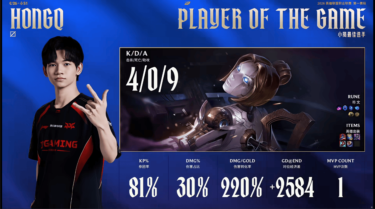 HongQ发条打出4/0/9战绩,斩获JDG对阵IG第二局MVP