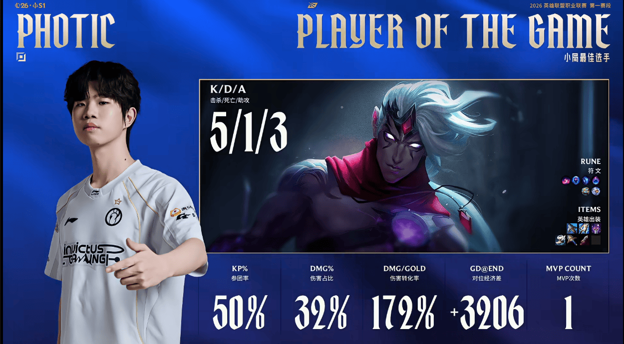 Photic韦鲁斯打出5/1/3战绩,斩获IG对阵JDG第三局MVP