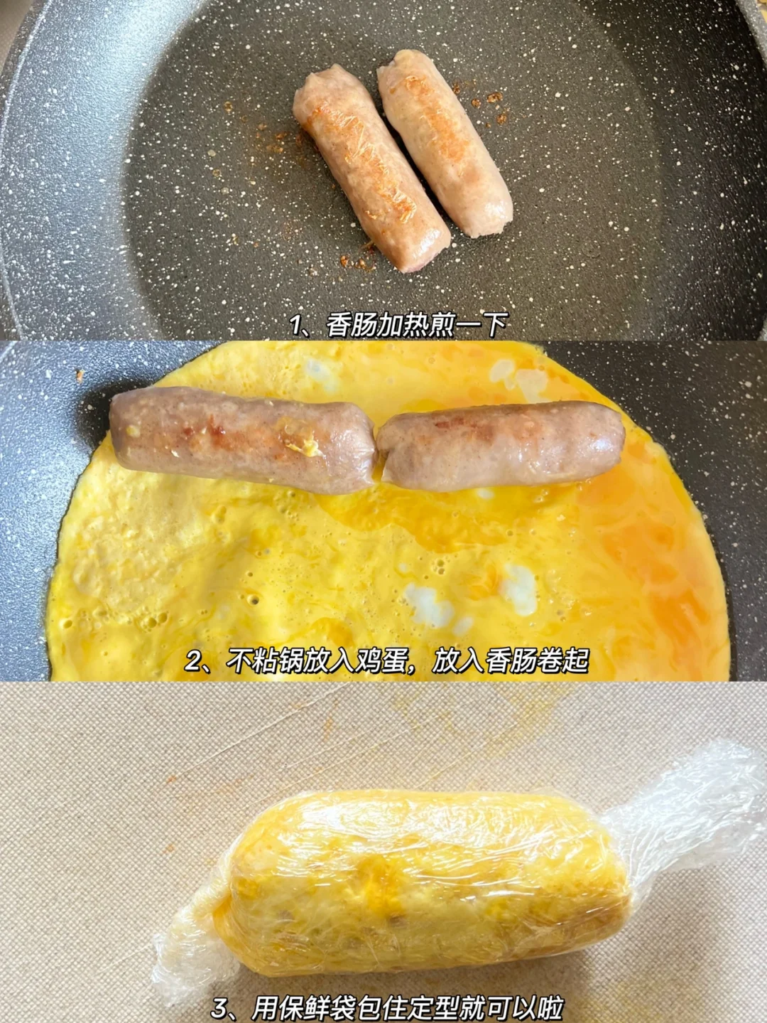 4、香肠加热煎一下,鸡蛋打散,小火煎快定型放入香肠卷起来,用保鲜膜定型,再挤上番茄酱表情就可以啦即可
