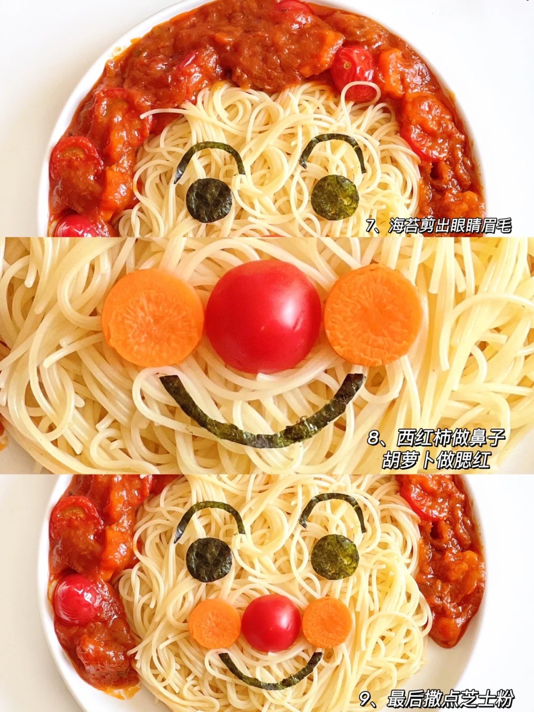 3、依次摆盘用海苔剪出眼睛眉毛嘴巴(如图),鼻子和脸颊用小番茄胡萝卜装饰,撒点芝士粉就完成啦!