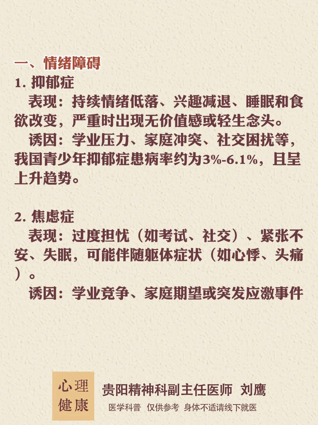 应对建议 家庭与学校支持:及时心理安抚,增加户外活动,减轻学业压力。 专业干预:若症状持续两周以上,需心理疏导或药物治疗。 自我调节:深呼吸、积极心理暗示,帮助情绪平稳。