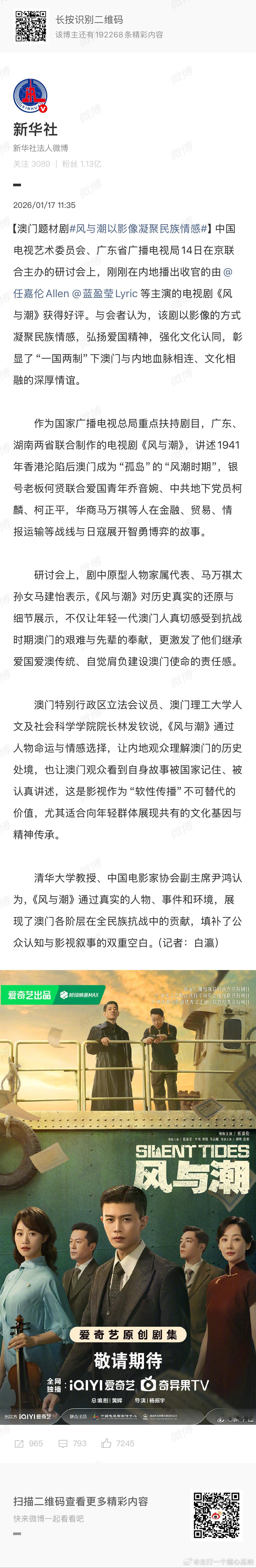 新华社报道任嘉伦《风与潮》,好评如潮!该剧以影像的方式凝聚民族情感,弘扬爱国精神,强化文化认同,彰显了“一国两制”下澳门与内地血脉相连、文化相融的深厚情谊!