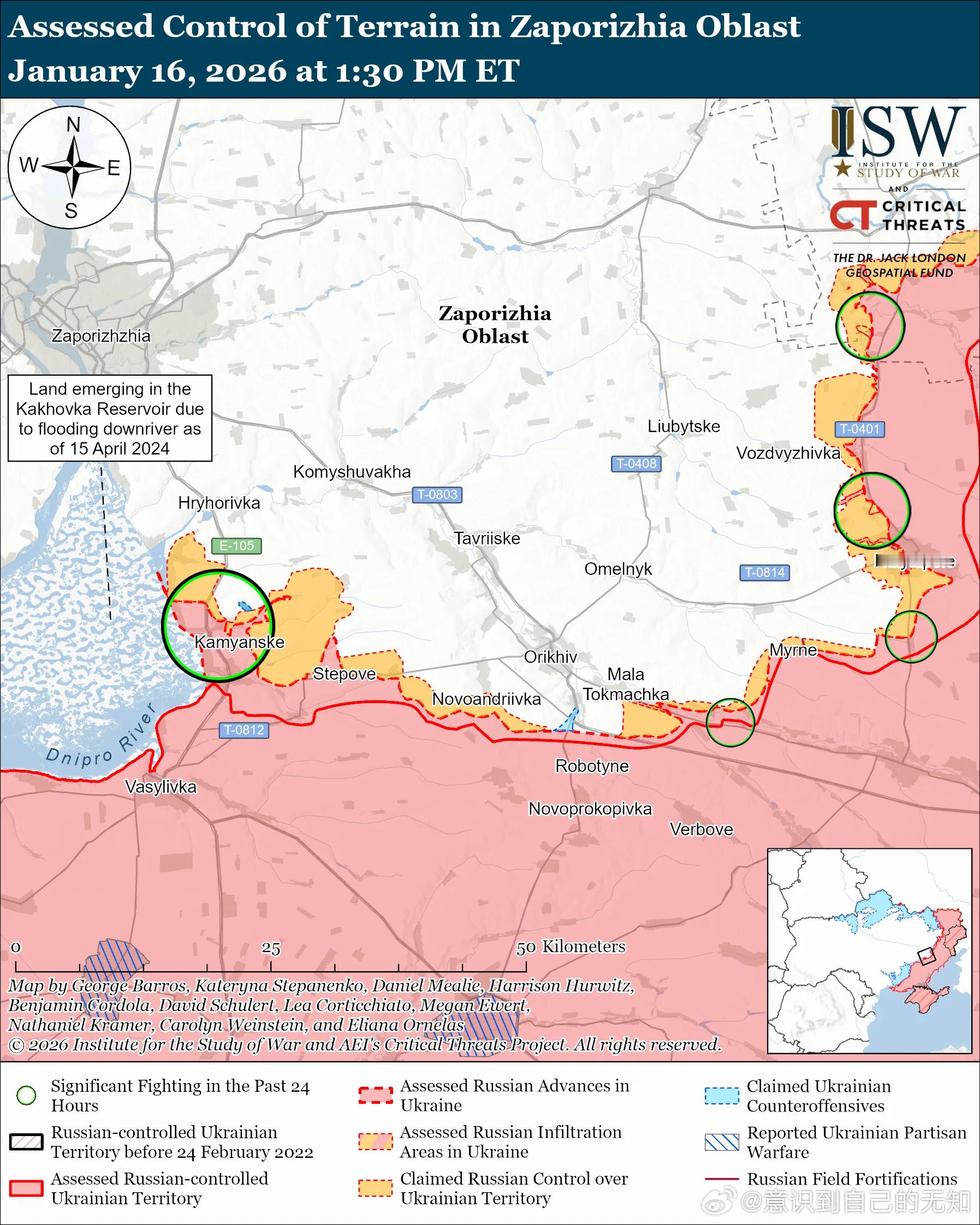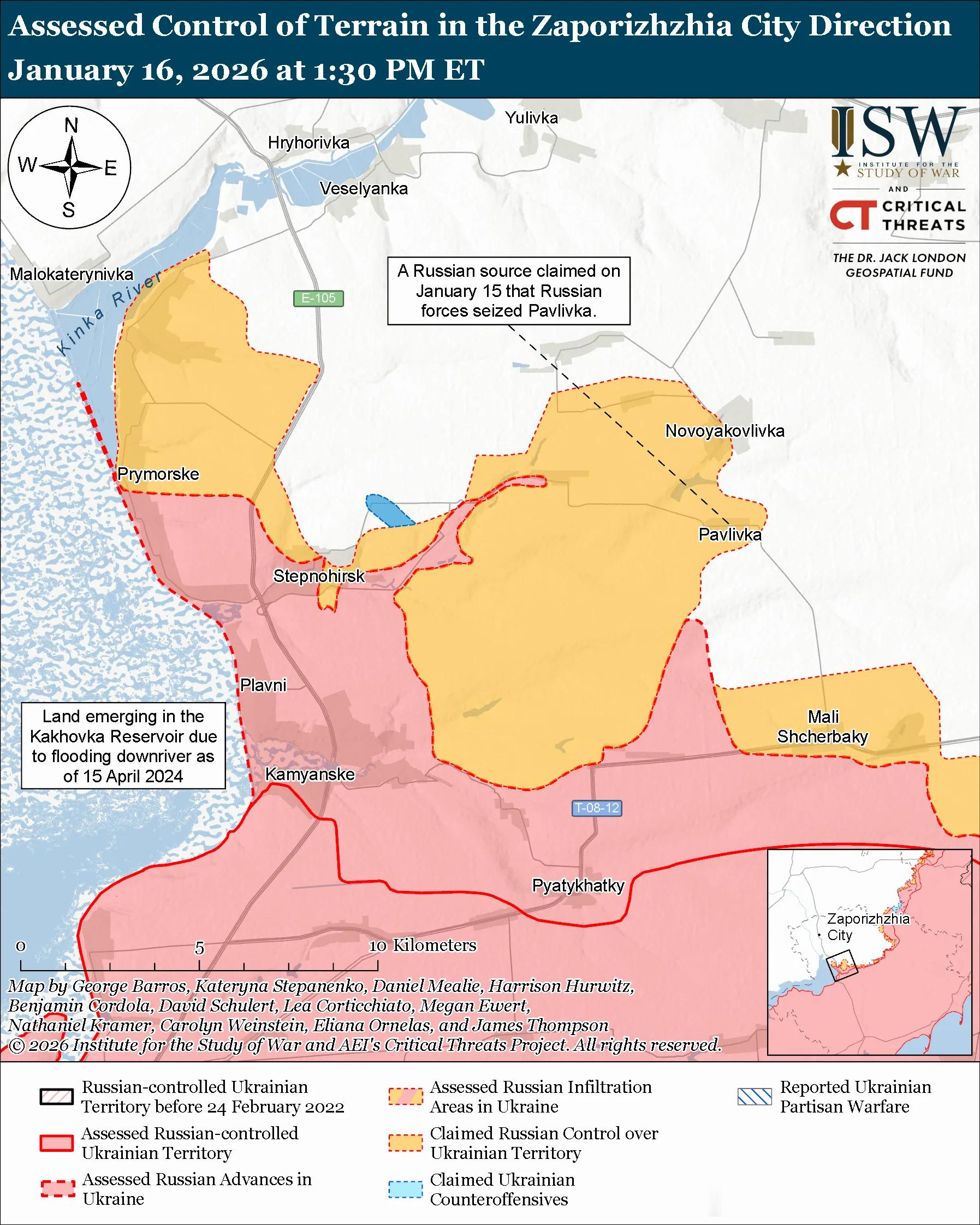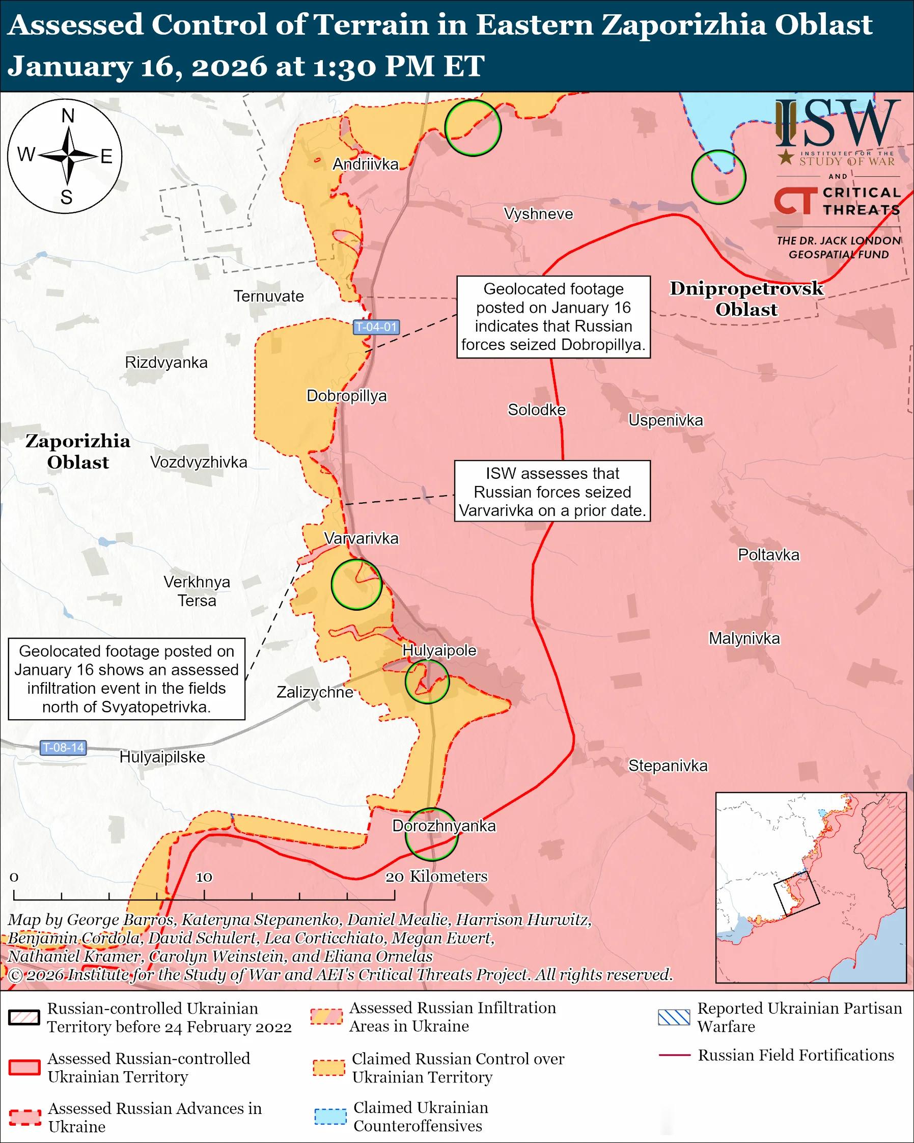 南方轴心俄军目标:守住前线阵地,确保后方免受乌克兰军队袭击,并推进至扎波罗热市的火炮射程之内。俄军最近向胡利亚波列方向推进。评估俄军进展:1月16日公布的地理定位视频显示,俄军占领了多布罗皮利亚(位于胡利亚伊波列西北部)。1月10日和16日公布的地理定位视频显示,乌克兰军队袭击了普里卢基西北部和斯维亚托佩特里夫卡北部(均位于胡利亚伊波列西北部)的俄军阵地,表明俄军可能已占领瓦尔瓦里夫卡(位于普里卢基和斯维亚托佩特里夫卡以东)。ISW评估认为,在斯维亚托佩特里夫卡北部活动的俄军正在进行渗透作战。未经证实的说法:俄罗斯国防部声称,俄第 394 摩步团(第 127 摩托化步兵师,第 5 集团军,东部军区)占领了奥列诺科斯蒂安蒂尼夫卡(位于胡利亚伊波列西北部)。1月15日和16日,俄军在胡利亚伊波列附近及境内发动进攻;在胡利亚伊波列西北部,靠近新扎波罗热、多布罗皮利亚、普里卢基、瓦尔瓦里夫卡、奥列诺科斯蒂安蒂尼夫卡和兹拉霍达,以及向茨维特科韦和捷尔努瓦特方向推进;在胡利亚伊波列北部,靠近泽列内和布拉茨克;在胡利亚伊波列东北部,靠近索洛德克、雷布内和叶戈里夫卡;以及在胡利亚伊波列西部,向扎利兹尼奇内方向推进。俄罗斯军事博客声称,乌克兰军队在胡利亚伊波列和捷尔努瓦特附近进行了反击。作战序列:据报道俄第 60 独立摩步旅(第 5 集团军)正在扎波罗热州作战,包括在胡利亚伊波列附近。1月16日俄军继续在扎波罗热州西部发动进攻,但并未取得确切进展。未经证实的说法:俄罗斯军事博客作者声称,俄军占领了帕夫利夫卡(奥里希夫以西),并向诺沃亚科夫利夫卡中心(奥里希夫西北部)推进。对俄军渗透区域进行评估:一位与克里姆林宫有关联的俄罗斯军事博主于 1 月 15 日表示,乌克兰军队控制了马拉托克马奇卡(奥里希夫东南部)和新达尼利夫卡(奥里希夫南部)的大部分地区——ISW 此前评估认为俄军曾在这些地区进行渗透行动。俄军攻击了奥里希夫东南部靠近马拉托克马奇卡的地方;奥里希夫以南,靠近Novodanylivka;奥里希夫以西,靠近斯特普诺希尔斯克、斯特波韦和卡缅斯克,朝向帕夫利夫卡;奥里希夫西北部靠近 Prymorske 和 Lukyanivske 以及前往 Veselyanka、Novoyakovlivka、Novoboikivske 和 Mahdalynivka 的方向。作战序列:据报道俄第417侦察营(第42步师,第58集团军,南部军区)的巡飞弹操作员正在斯捷普诺戈尔斯克附近打击乌克兰的电子战系统。第7和第104空降师继续在扎波罗热州作战。据报道俄军正在被占领的扎波罗热核电站(ZNPP)附近部署军事装备。乌克兰南方防卫军发言人弗拉迪斯拉夫·沃洛申上校于1月16日报告称,视频显示俄军正在被占领的扎波罗热核电站核反应堆附近部署军事装备。沃洛申表示,乌克兰侦察部队在反应堆厂房屋顶上发现了多个射击点以及数个隐藏天线。乌克兰军队继续对俄罗斯军事目标进行中程打击。乌克兰总参谋部1月16日报告称,乌克兰军队袭击了位于被占领的扎波罗热州普里莫尔斯克(距前线约92公里)的俄第76空降师的一个弹药库。1月16日俄军继续向赫尔松方向发起有限的地面进攻,但并未取得进展。1月15日和16日,俄军在赫尔松市以东的安东尼夫斯基桥附近以及赫尔松州的某些地区发动了进攻。作战序列:俄第 98 空降师的无人机操作员正在赫尔松市打击据称是乌克兰军队的目标。第 299 空降团和第 1065 空降炮兵团(均隶属于第 98 空降师)继续在赫尔松州作战。