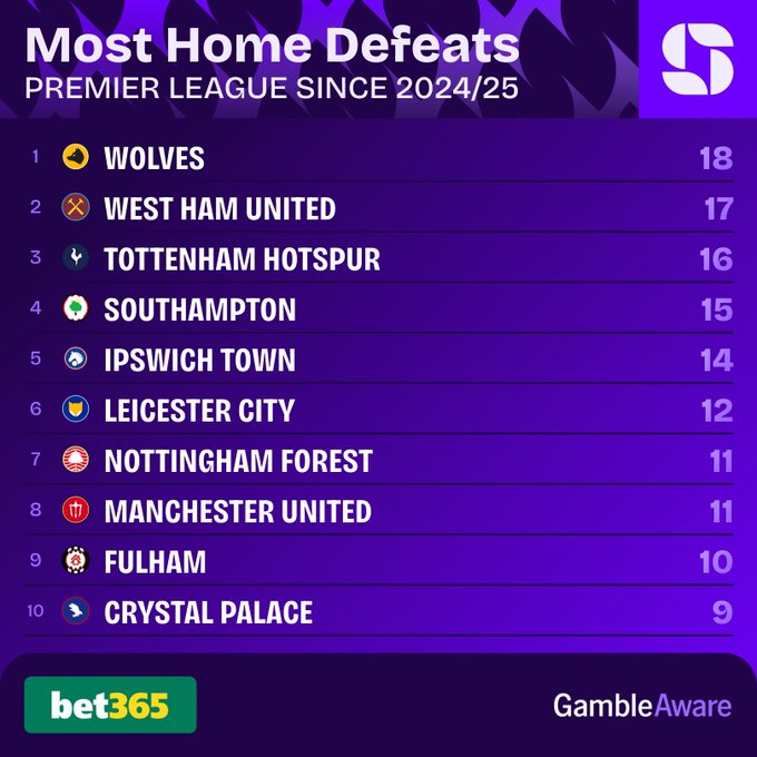 赛后squawka数据统计,盘点英超自2024/25赛季以来主场失利场次最多的球队,热刺16场失利同期仅次于狼队与西汉姆联: