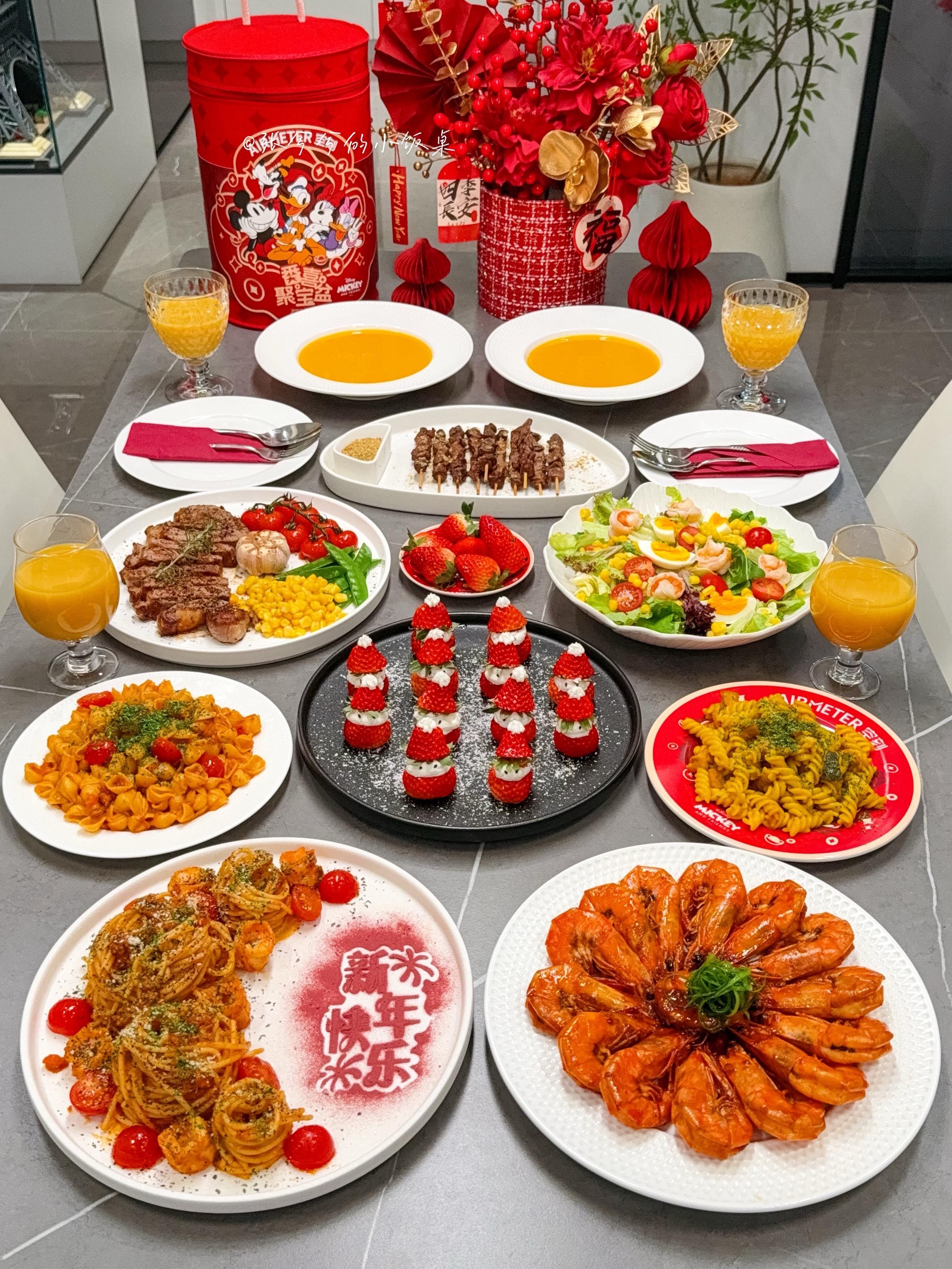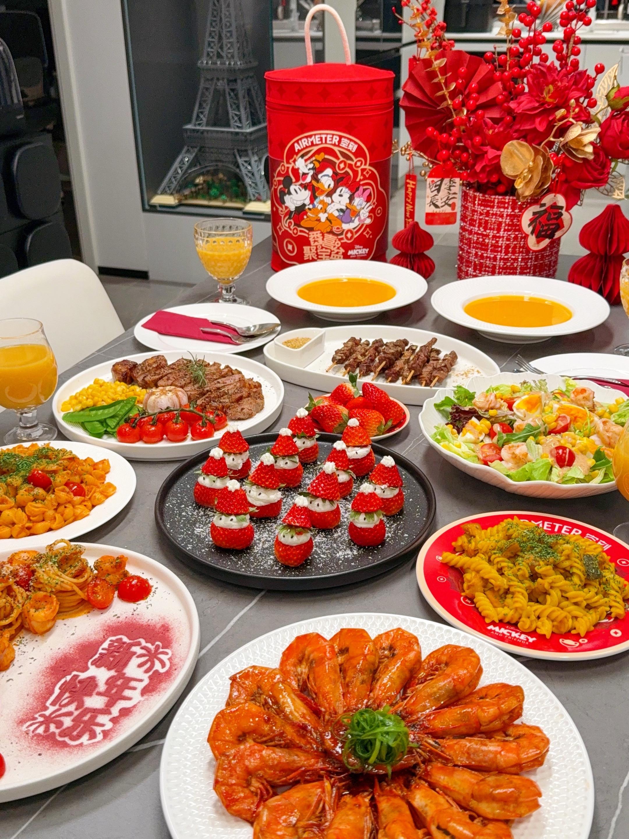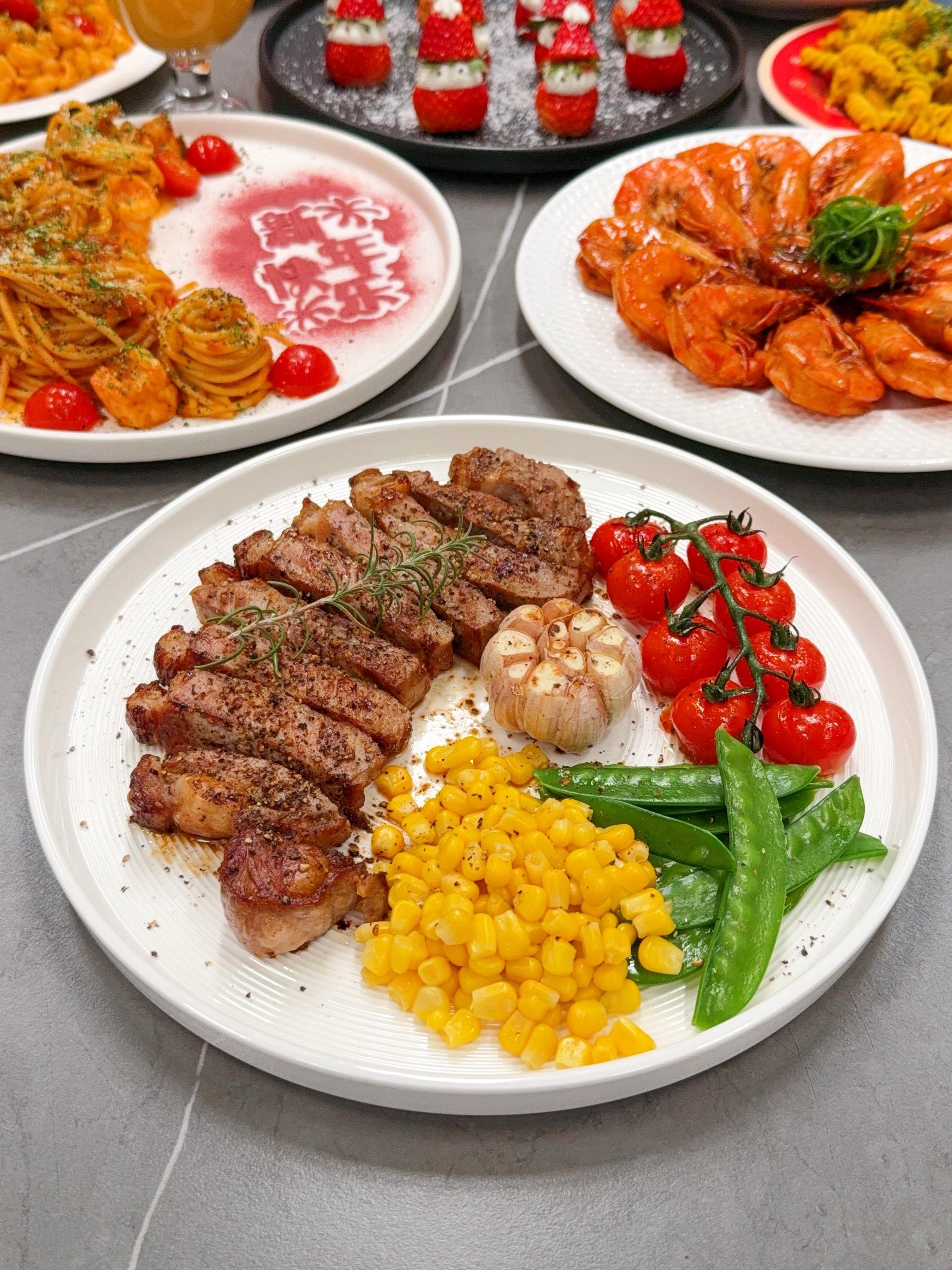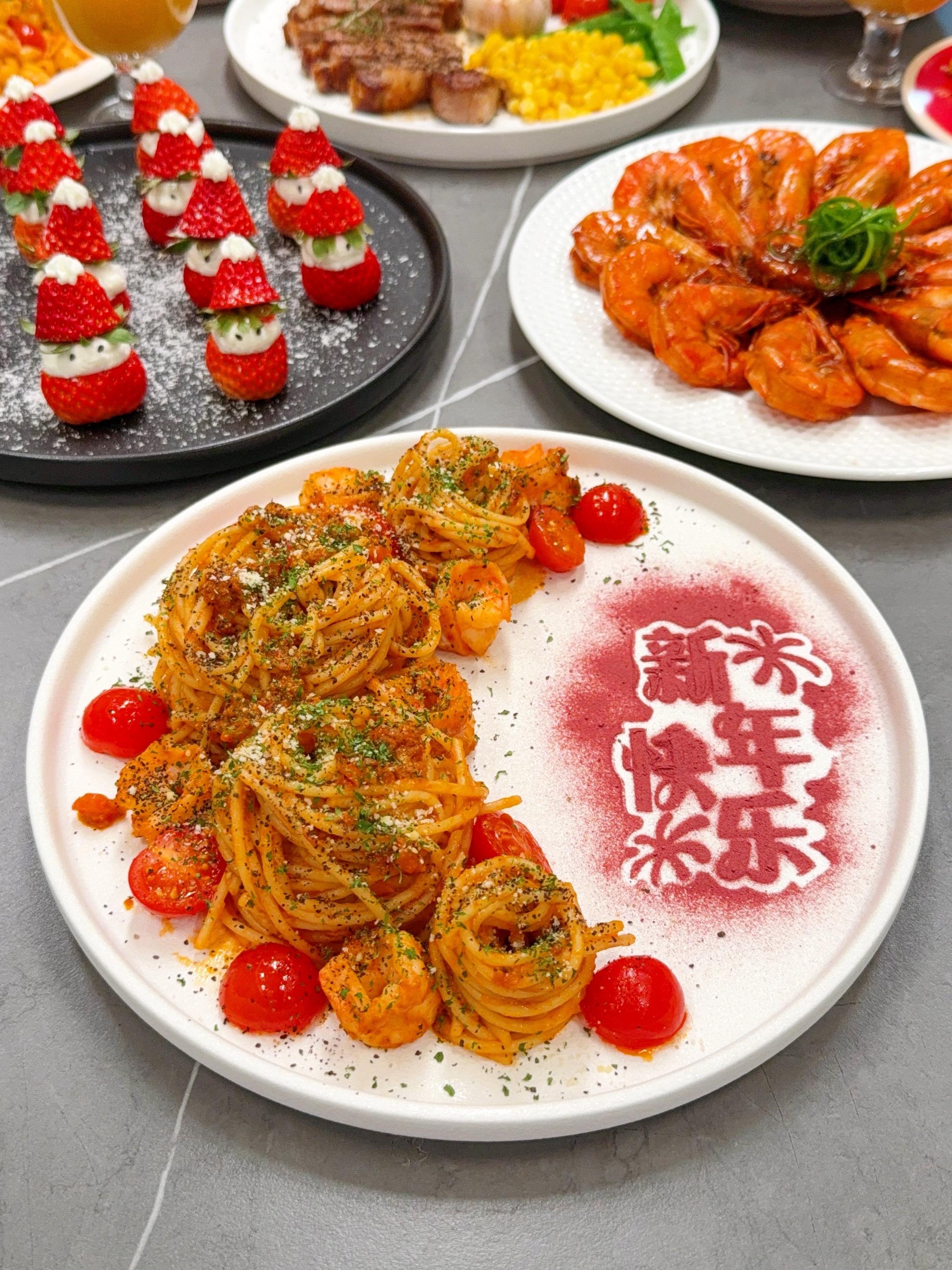 新年家宴|在家轻松搞定餐桌仪式感。新年倒计时,厨房的灯光总是暖暖的💡 今天做了一桌做“中西合璧”的家宴招待朋友,既有熟悉的年味,又有新鲜的惊喜。 🧧新年家宴菜单分享: ❶【油焖大虾】 ❷【煎西冷牛排】 ❸【番茄肉酱意面】 ❹【法式奶香贝贝南瓜鸡肉意面】 ❺【儿童番茄肉酱意面】 ❻【烤羊肉串】 ❼【小米南瓜羹】 ❽【蔬菜沙拉】