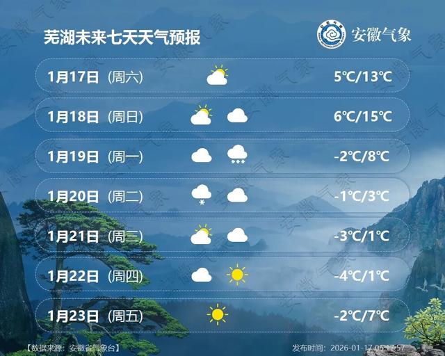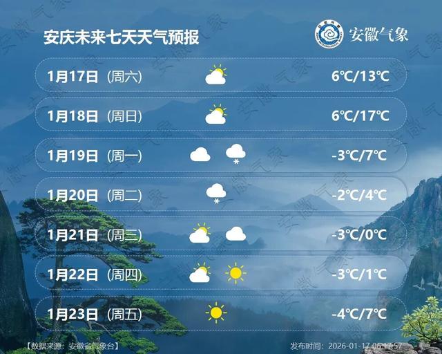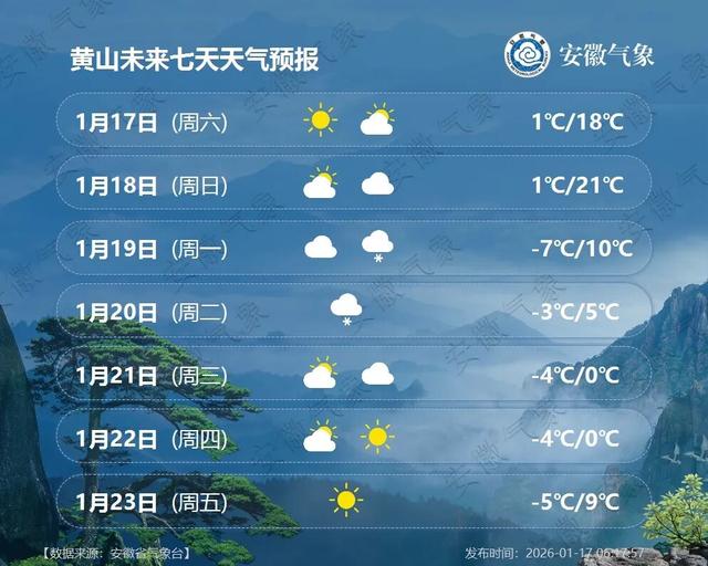 21日(周三):大别山区和皖南山区阴天,局部有小雪;其他地区多云。