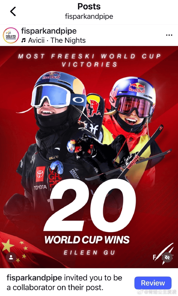 今天早上,谷爱凌更新个人社媒,谈世界杯夺个人第20冠: