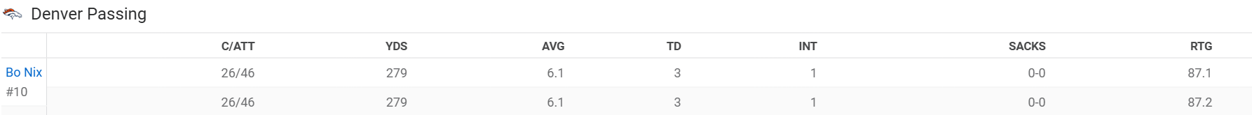 全场比赛,丹佛野马四分卫博-尼克斯46次传球完成26次,传出279码,贡献3次达阵,1次被抄截,四分卫评分为87.1。