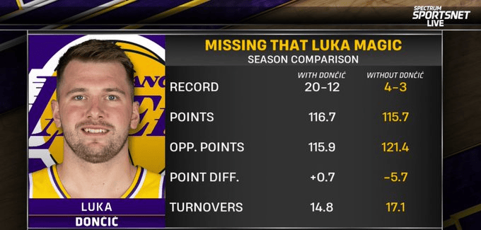 赛前,转播方给出了湖人在东契奇缺阵与否时的数据: