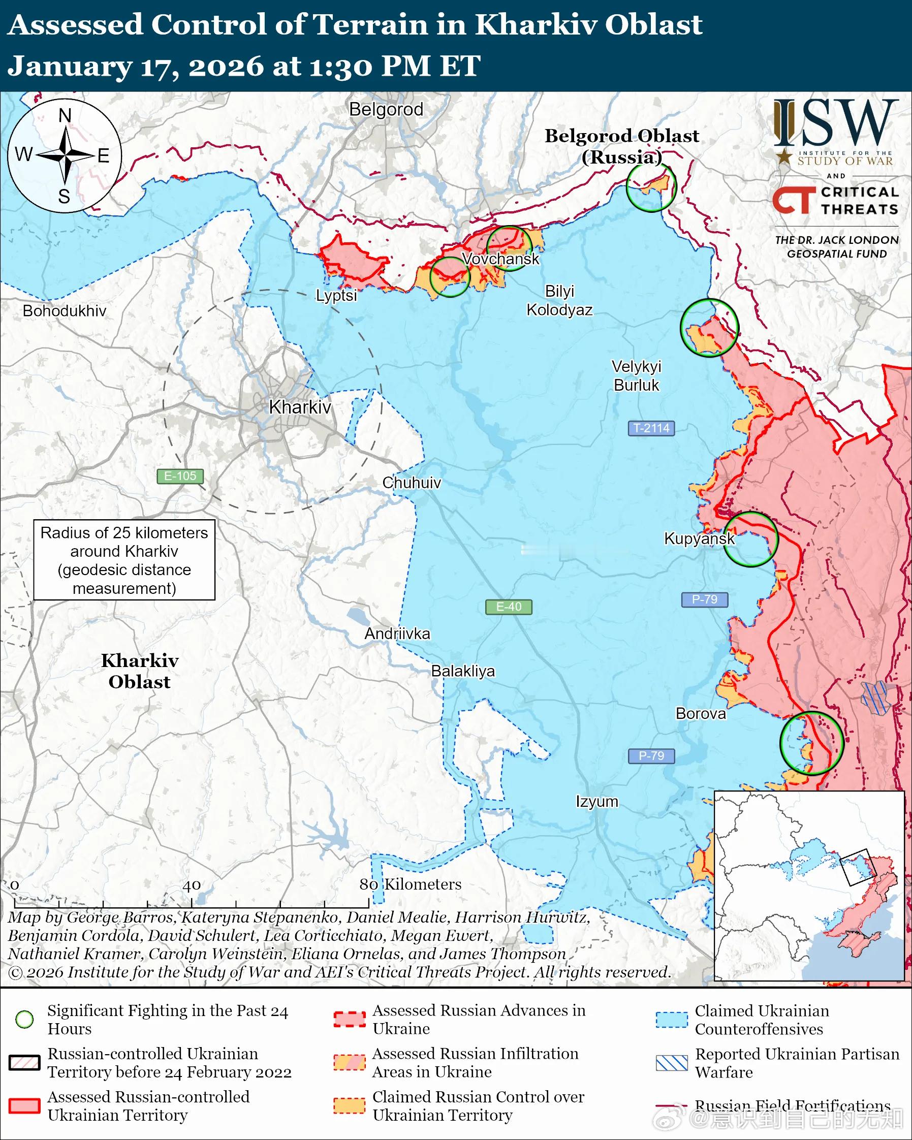 俄军主要行动2——奥斯基尔河俄军目标:渡过哈尔科夫州的奥斯基尔河,向西推进至哈尔科夫州东部和顿涅茨克州北部。乌克兰军队最近向库皮扬斯克方向推进。评估乌克兰的进展:1 月 15 日发布的地理定位视频显示,乌克兰军队向库皮扬斯克以北推进。1月16日和17日,俄军在库皮扬斯克市内、库皮扬斯克东北部的德沃里奇纳和克拉斯涅佩尔舍附近、库皮扬斯克东部的彼得罗巴甫洛夫卡、波多利和库切里夫卡方向以及库皮扬斯克东南部的皮什恰内和库里利夫卡方向发动进攻。一位俄罗斯军事博客作者声称,乌克兰军队在金德拉希夫卡和拉德基夫卡(均位于库皮扬斯克北部)附近进行了反击。一位白俄罗斯军事博主声称,乌克兰军队已包围了库皮扬斯克的俄军。另一位军事博主声称,俄罗斯军人抱怨俄高级军事指挥官在 1 月 16 日关于在库皮扬斯克取得进展的虚假声明。1月16日和17日,俄军继续在博罗瓦东南方向的新沃迪亚内和新谢尔盖夫卡附近发动进攻,但没有取得进展。一支在博罗瓦方向作战的乌军旅驳斥了俄方关于占领新普拉托尼夫卡(博罗瓦以北)的说法,这与俄罗斯军事博客作者驳斥俄军于 1 月 6 日占领新普拉托尼夫卡的说法一致。