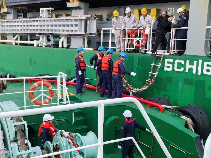 接报后,揭阳市海(水)上搜救分中心迅速启动应急处置程序,第一时间与船方建立联系,详细了解船员身体状况及船舶位置、航行状态,并通过电话、VHF等方式持续跟踪伤病人员情况变化,科学研判救援条件,及时制定救援方案。根据现场实际情况,搜救分中心指挥引导“信盛XX”轮驶往惠来靖海电厂码头方向,并迅速协调海事执法人员搭乘港作拖轮赶赴现场进行接应救助工作。同时,岸上同步启动医疗保障,提前联系120急救中心,调派救护车和医护人员在码头待命,确保船员上岸后第一时间得到救治。在搜救分中心统一指挥和多方密切配合下,参与救援各方全力以赴进行了一场海上人命救助接力,为船员争取了宝贵的救治时间。当天1805时,患病船员顺利转移上岸并及时送医,成功化解了一起海上人员突发疾病险情。