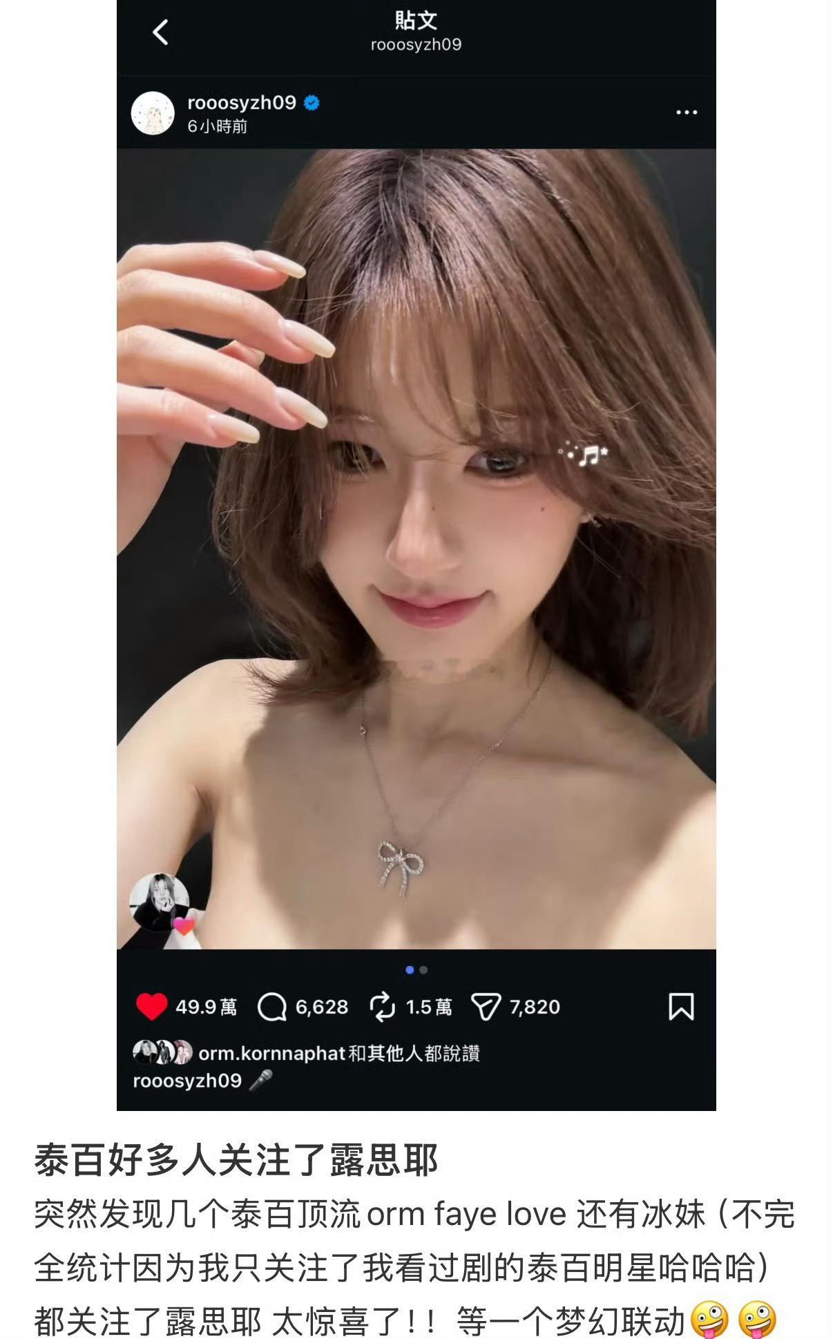 泰百顶流Orm Kornnaphat关注赵露思ins并点赞最新ins