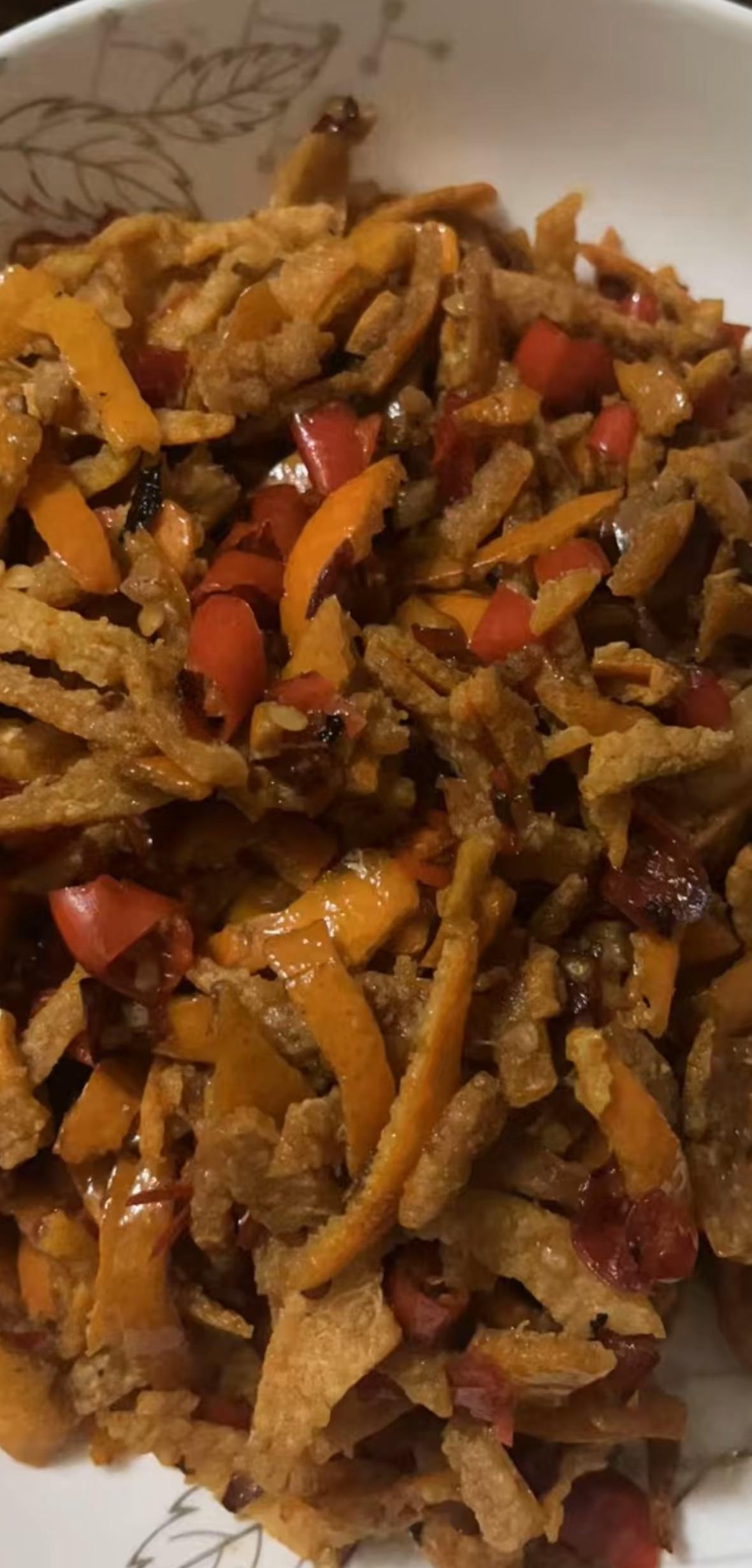 四川人真是啥都敢吃! 桔子皮焯水之后,把水分挤干,加入各种调料,吃起来那叫一个爽快! 还有另一种做法,焯水挤干苦水后,和肉丝一起炒,香气扑鼻! 桔子皮晒干用来泡水喝,能缓解咳嗽。 晒干后用来炖肉,肉质软烂,香糯可口! 你吃过用桔子皮做的这些美食吗?