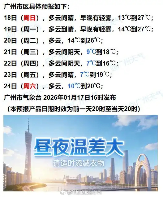 【气温将上演“高台跳水” #广州最低或降至7℃#】跳水式降温即将到来!最近你穿短袖了吗?广州最近最高气温在27℃左右。这也让即将到来的降温显得比较猛。21日,全省齐齐明显降温,广州后面几天最低降至7℃。17日至21日,受寒潮影响,国内中东部地区将出现入冬以来最强雨雪冰冻天气过程。由于南方回暖强劲,寒潮到广东后将降级为较强冷空气,但千万别小看它。20日-23日,受其影响,广东将有一次大风降温过程,粤北将出现大范围低温。●广州天气具体预报1月18日,多云间晴,早晚有轻雾,气温13℃~27℃1月19日,多云到晴,早晚有轻雾,气温14℃~27℃1月20日,多云,气温14℃~26℃