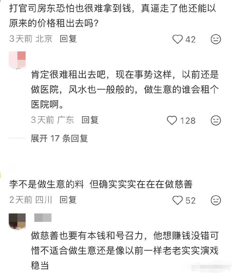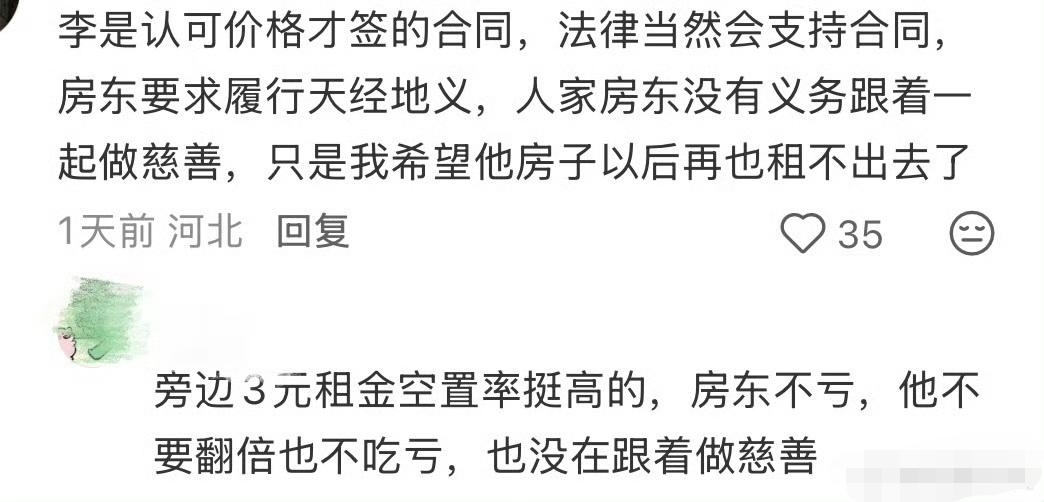 既然是当初签订合同你情我愿的事情,也不能责怪房东,当初价高的时候房东低价租给了你,现在价格跌了房东就不能按原价(高价)继续租了吗?更何况还在合同期内。 其实房东和李亚鹏都没错,现在最好的解决的办法是大家都退一步,房东也别租7元,李亚鹏也别按市场价3元,折中按5元就好了,然后这是慈善公益事业,我相信事情报道出后,会有很多明星或者企业愿意捐赠支持医院继续运营下去的。你们觉得呢?