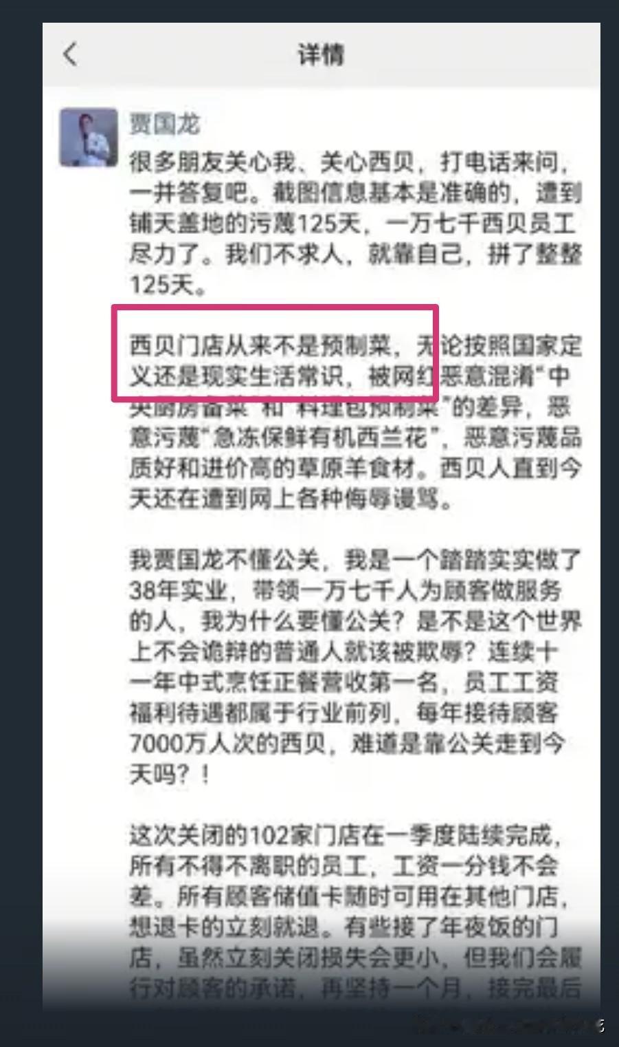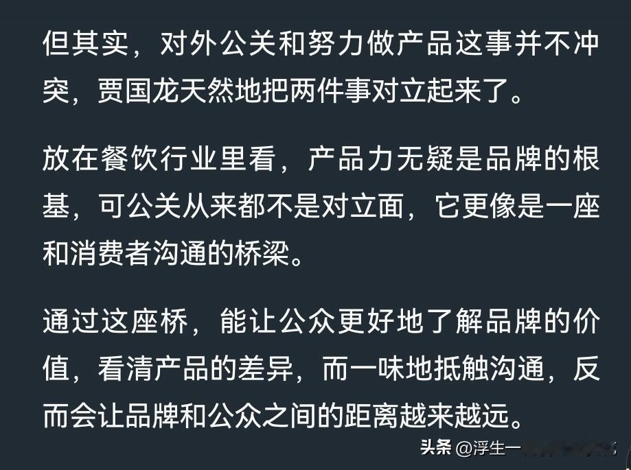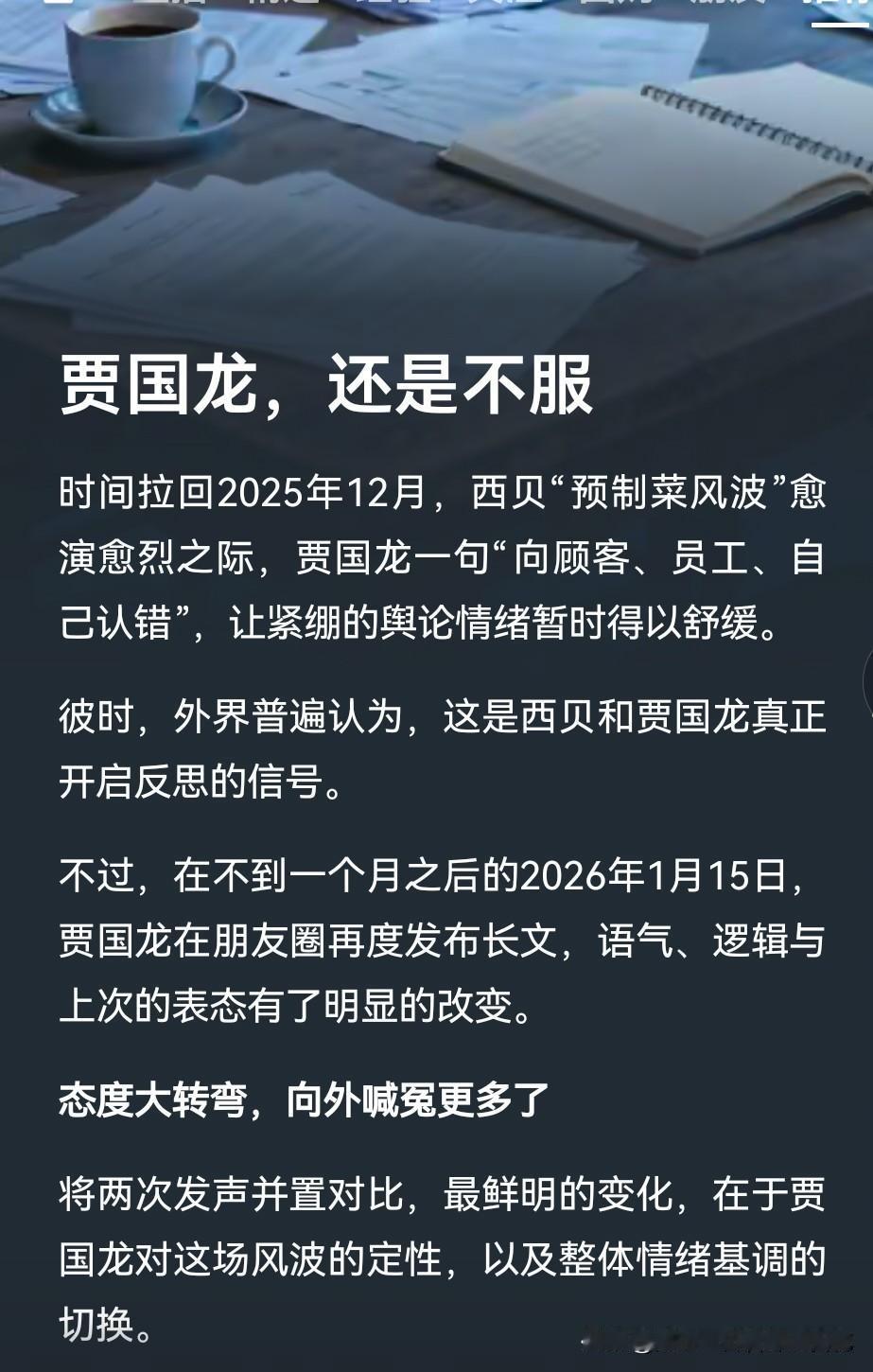 贾国龙不但不懂互联网,也不懂公关,甚至不懂消费者!舆论来了,他硬刚;需要公关的时候,他单枪匹马,赤膊上阵;消费者吐槽,他自己豁出去了…… 谁是甲方,贾国龙可能至今都没有回过神来。也不知道这38年实业是怎么做起来的,难道是时代选中了西贝?其实消费者就是甲方,甲方有知情权,也有评价权,难吃就是难吃,贵就是贵,不行就是不行。 但贾国龙不以为然,难吃是因为你挑刺,贵是因为你穷,不行就是跟我过不去。那么这样的企业家就没什么格局可言了。老罗作为消费者,原本没有想过要搞垮西贝,只是贾老板不饶人,非得让罗永浩道歉。即便老罗给你道歉、认输,顾客不买账,全是白搭。贾老板要做的是,赢得广大消费者理解支持,很难吗?