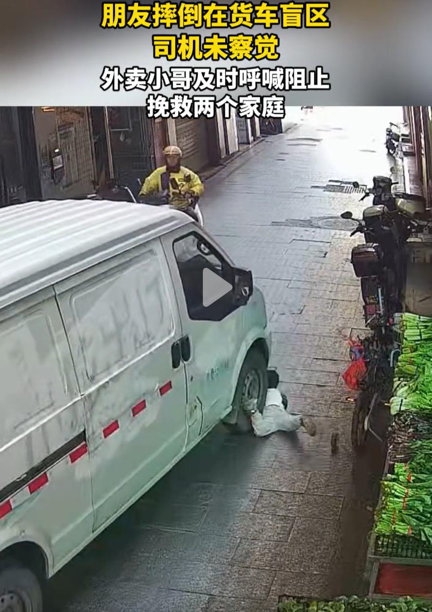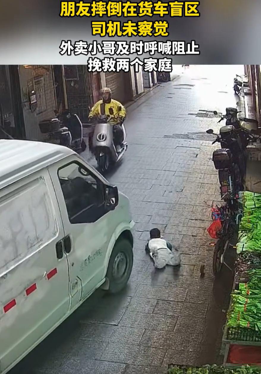 这可是救命之恩啊!广东,一名小朋友在门前玩耍时,突然摔倒趴地,而他摔倒的位置,刚好是一辆货车的盲区,司机完全没有察觉,眼看就要压上去时,一名外卖小哥经过,两嗓子制止了司机,也挽救了两个家庭 监控显示,一辆货车停在路边卸货,司机忙完回到驾驶座准备离开。就在这时候,两个小孩追逐玩耍,其中一个孩子跑得慢了些,从车尾绕过来时,司机已经上车了,谁也没看见谁 最揪心的一幕来了。那孩子不知怎的突然摔倒在地,就趴在货车前轮旁边,一动不动。货车开始往前开了,车轮已经贴到了孩子的衣服 千钧一发之际,一个外卖小哥骑车经过,瞥见车底下的孩子,立刻扯着嗓子大喊起来。司机猛地刹车,避免一场可能发生的悲剧 有人说这是路见不平一声吼,但我觉得这声吼太珍贵了。外卖小哥那会儿正赶着送单吧,多等一秒可能就要超时、被投诉、扣钱。可他选择了停下,选择了喊那一嗓子 货车的盲区真的可怕。我记得有数据说,货车正前方两米内、两侧后视镜下方、正后方十米内,都是司机的绝对盲区。孩子那么小,趴在地上,司机在驾驶座上根本看不见 看到视频里孩子趴在地上迟迟不起身,我特别想提醒家长们:真得反复告诉孩子,远离大车,不管是停着的还是开着的。停车场的车、路边的车,都不要在旁边玩耍。而且路上也不是休息的地方,司机们也千万要在上车前绕车看一眼,这个动作可能只需要十秒钟,但能避免一辈子的遗憾