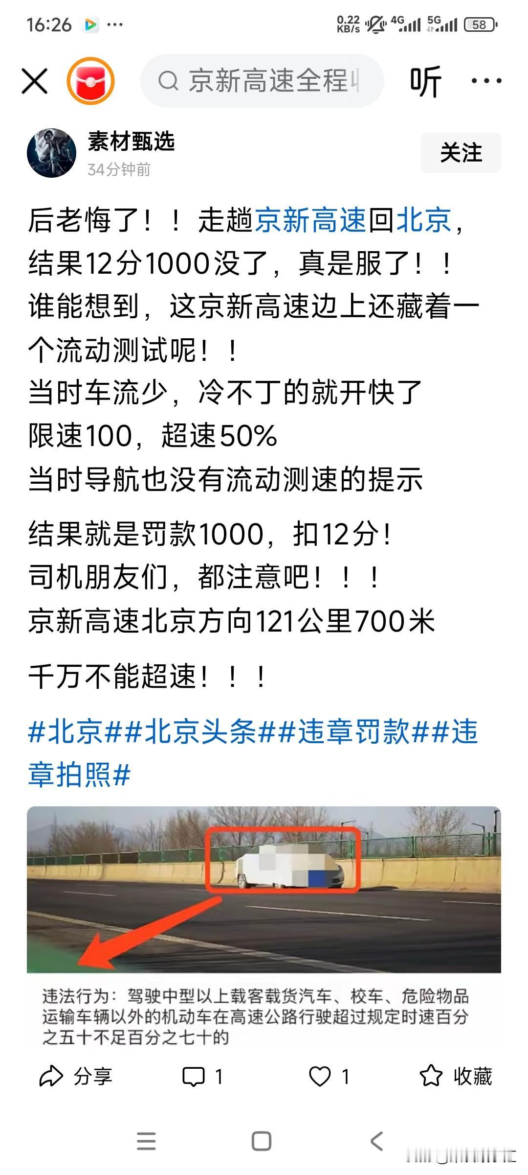 有网友反映在走京新高速的时候,北京段由于超速被罚1000元,扣12分。 按照网友所说的,他当时所开的车速是100迈。那么他超过了50%。 难道说一条高速公路有限速50km的地方吗? 50km在高速上进行限速,这显然是不合理的。 有可能这位网友在开车的时候,他已经开过了150迈左右,高速上的限速如果在100也是可以理解的。 真实情况有待确认。 超速流动测速的公里段已经公示了,有想验证的车友朋友们可以亲身测试一下。此处的限速是不是50km!超速扣分规则 高速公路限速 高速超速罚款 京城高速 北京四环高速