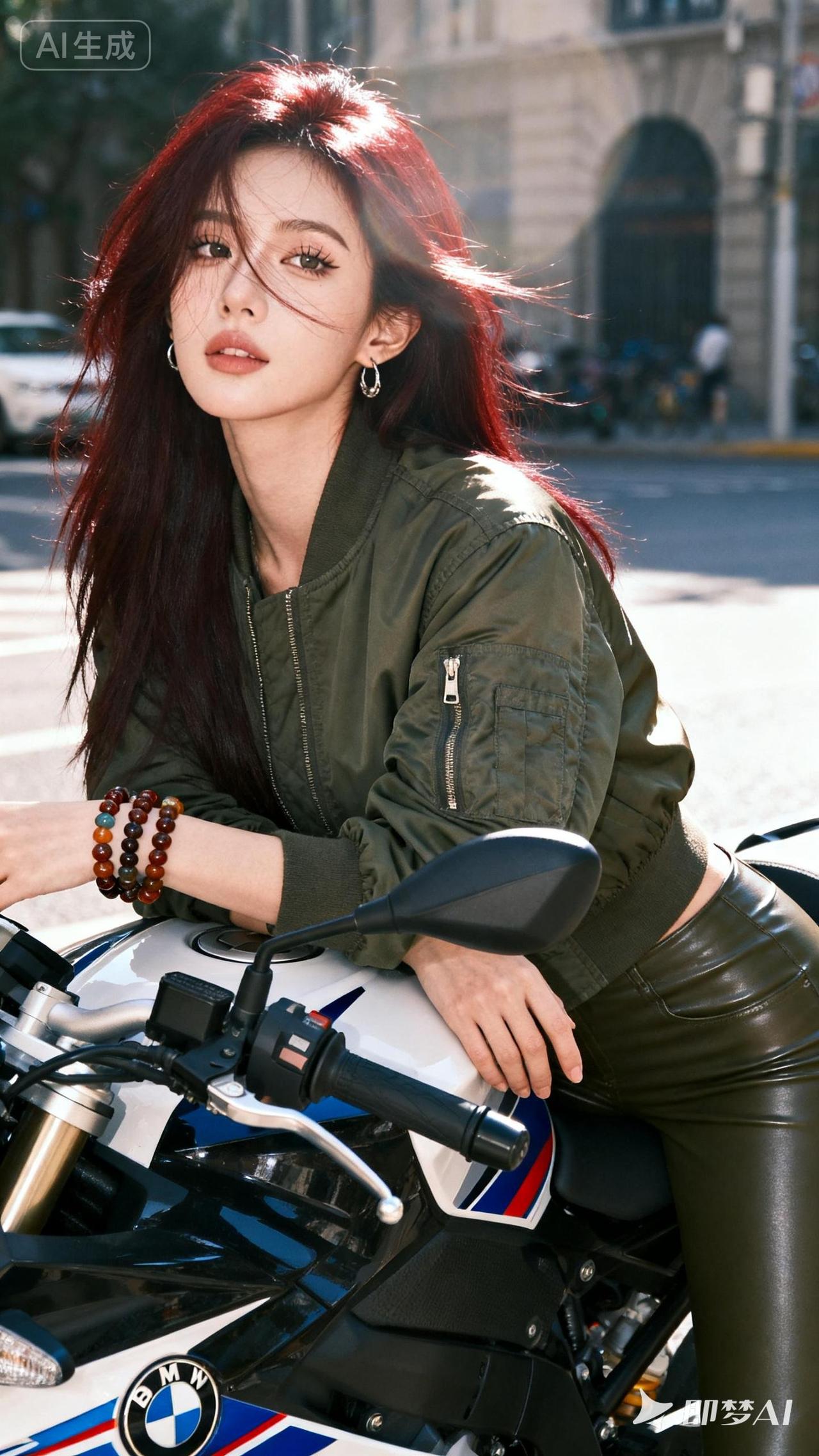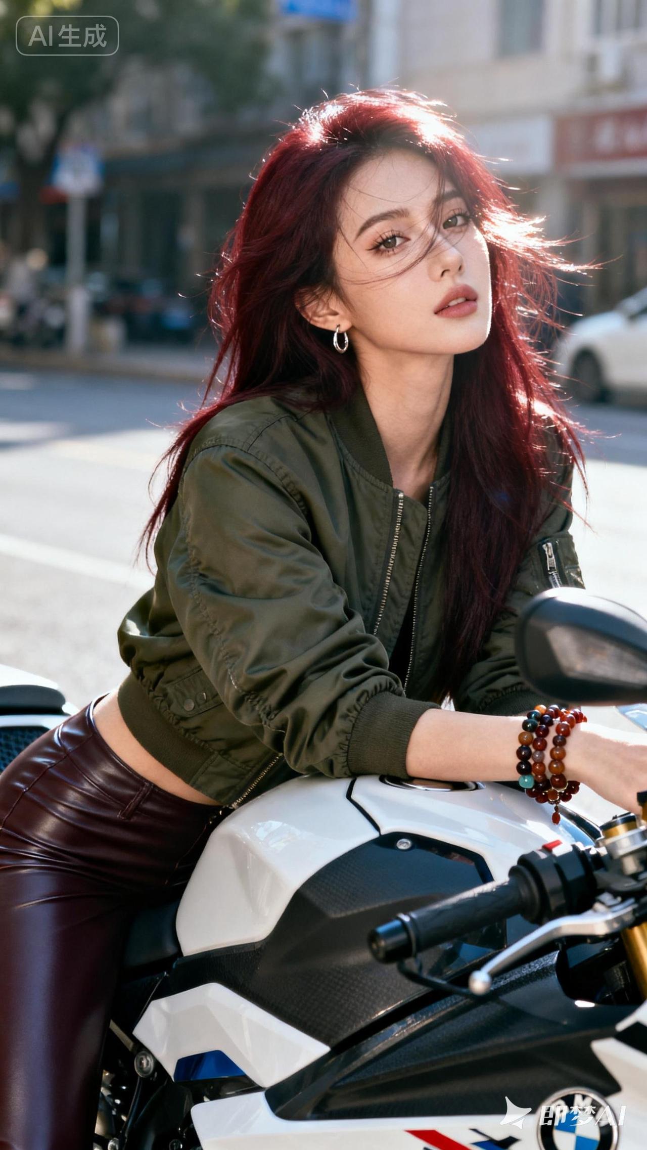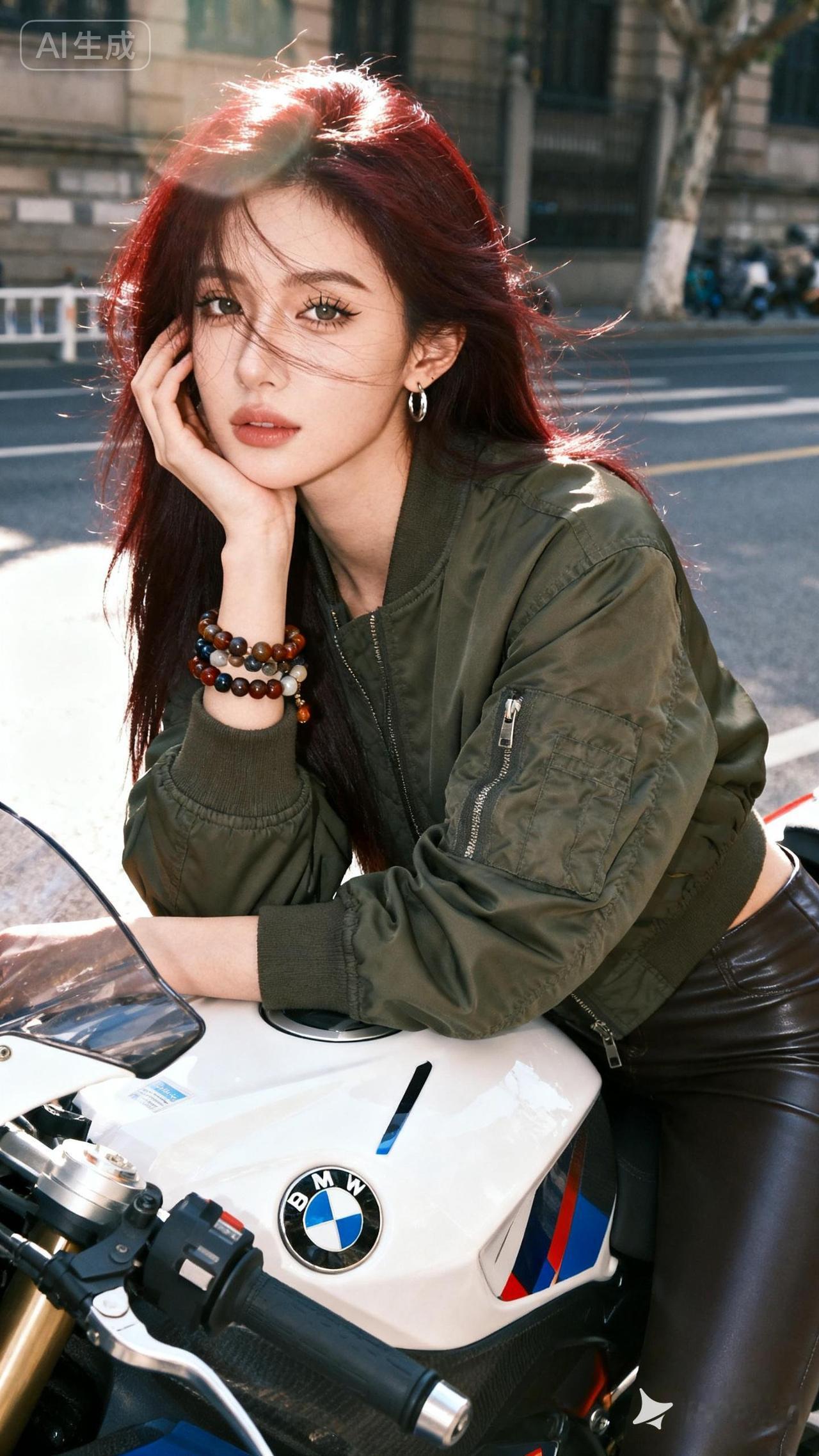 酷炫红发少女,BMW摩托风范,都市街头时尚大片!