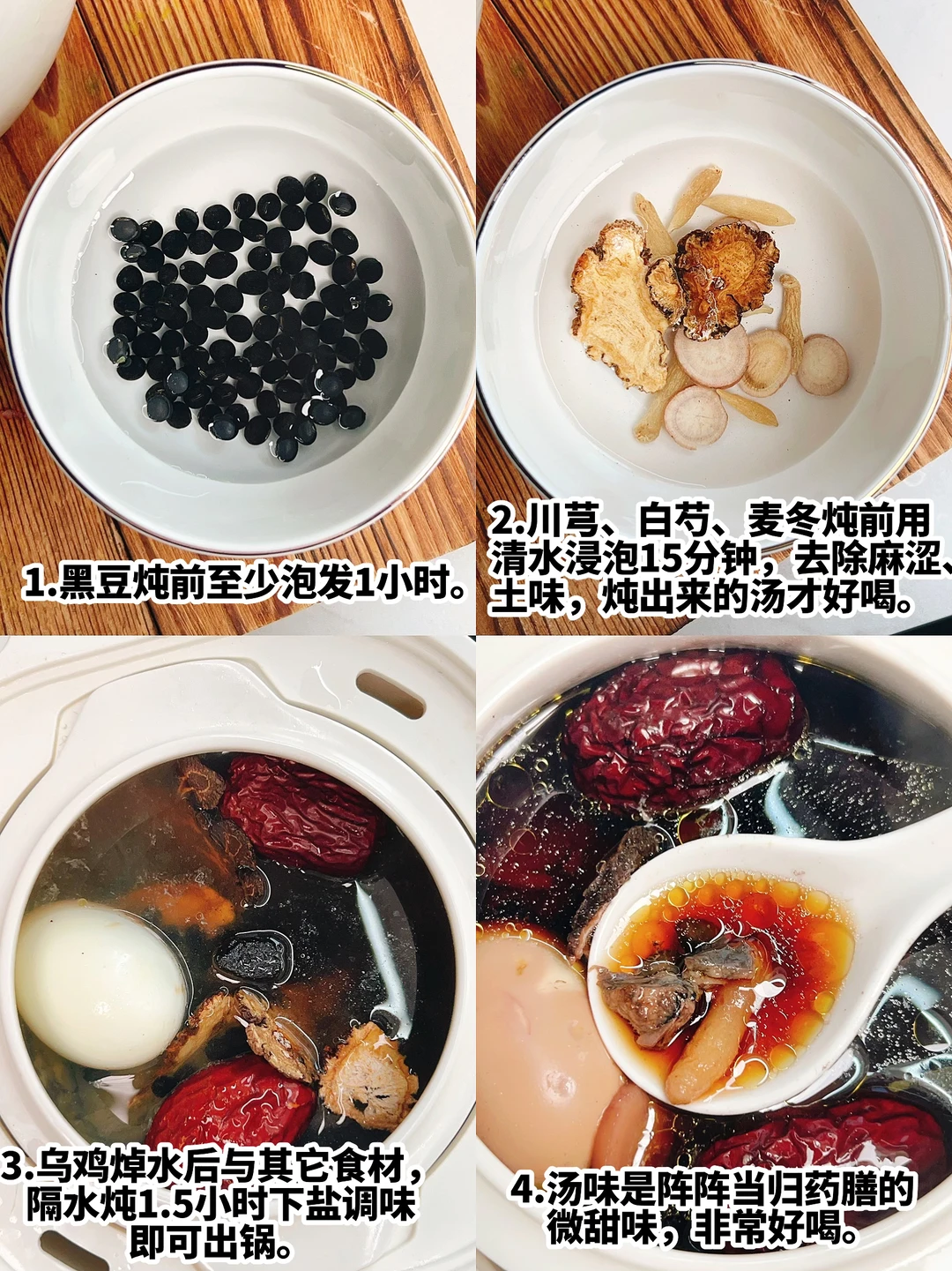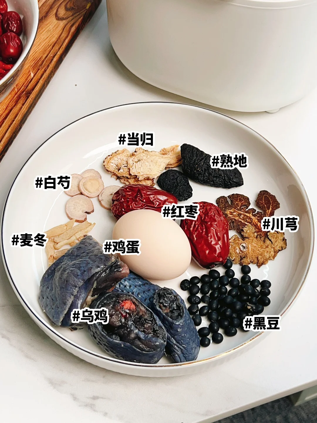 ▫️当归8g▫️川芎5g▫️熟地10g▫️白芍8g▫️黑豆10g▫️麦冬8g▫️红枣5颗▫️鸡蛋1只▫️乌鸡200g