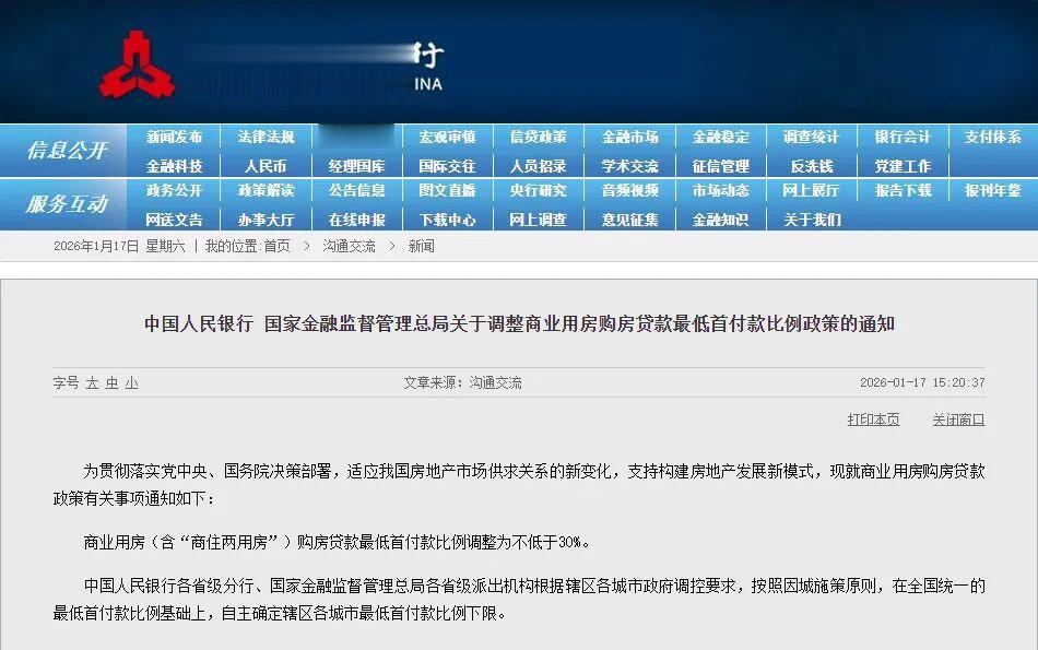 中国人民银行网站1月17日消息,中国人民银行、国家金融监督管理总局发布《关于调整商业用房购房贷款最低首付款比例政策的通知》。