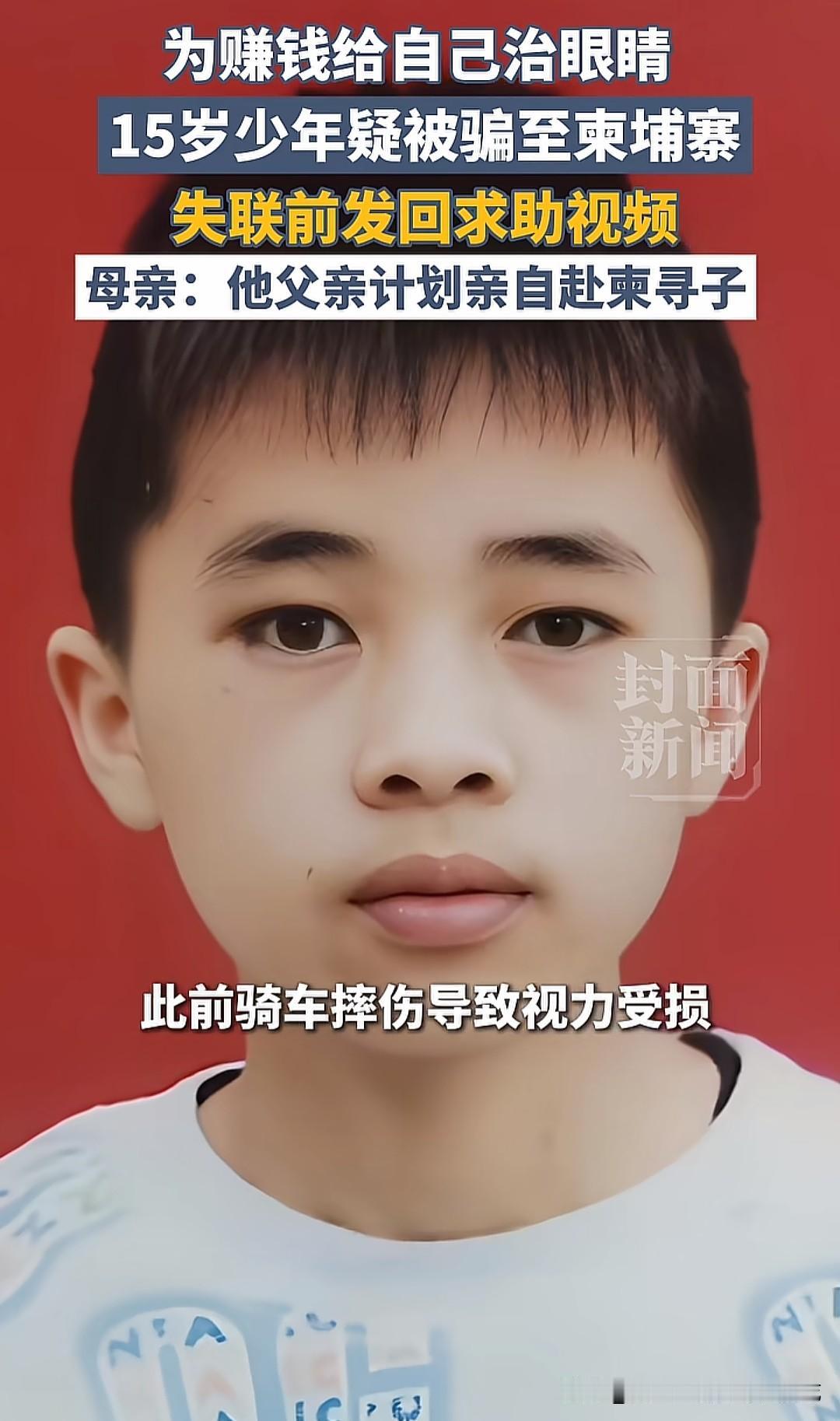又一个少年疑被骗至柬埔寨失联了!四川凉山一少年被人引路骗至柬埔寨之后,手机被没收,从此失去了与外界的联系。事发前还发视频求助,称自己很想回家,一刻也不想待这个鬼地方,很后悔当初的决定。 据了解,这位少年今年15岁,由于骑车摔伤导致视力受损,想多赚点钱给自己的眼睛治病,听说那边月薪过万,一年能搞到很多钱,然后就去了。结果可想而知,钱没那么好赚的,而且都是一些歪门邪道,业绩不达标就会受到虐待,能不能安全回来都是一个谜。 不难发现,很多人铤而走险无非就是为了那份诱人的高薪,他们应该知道自己去做什么的。但是他们忽略掉的是,你的人身安全,你的自由,你的一切,谁来给你保障呢?