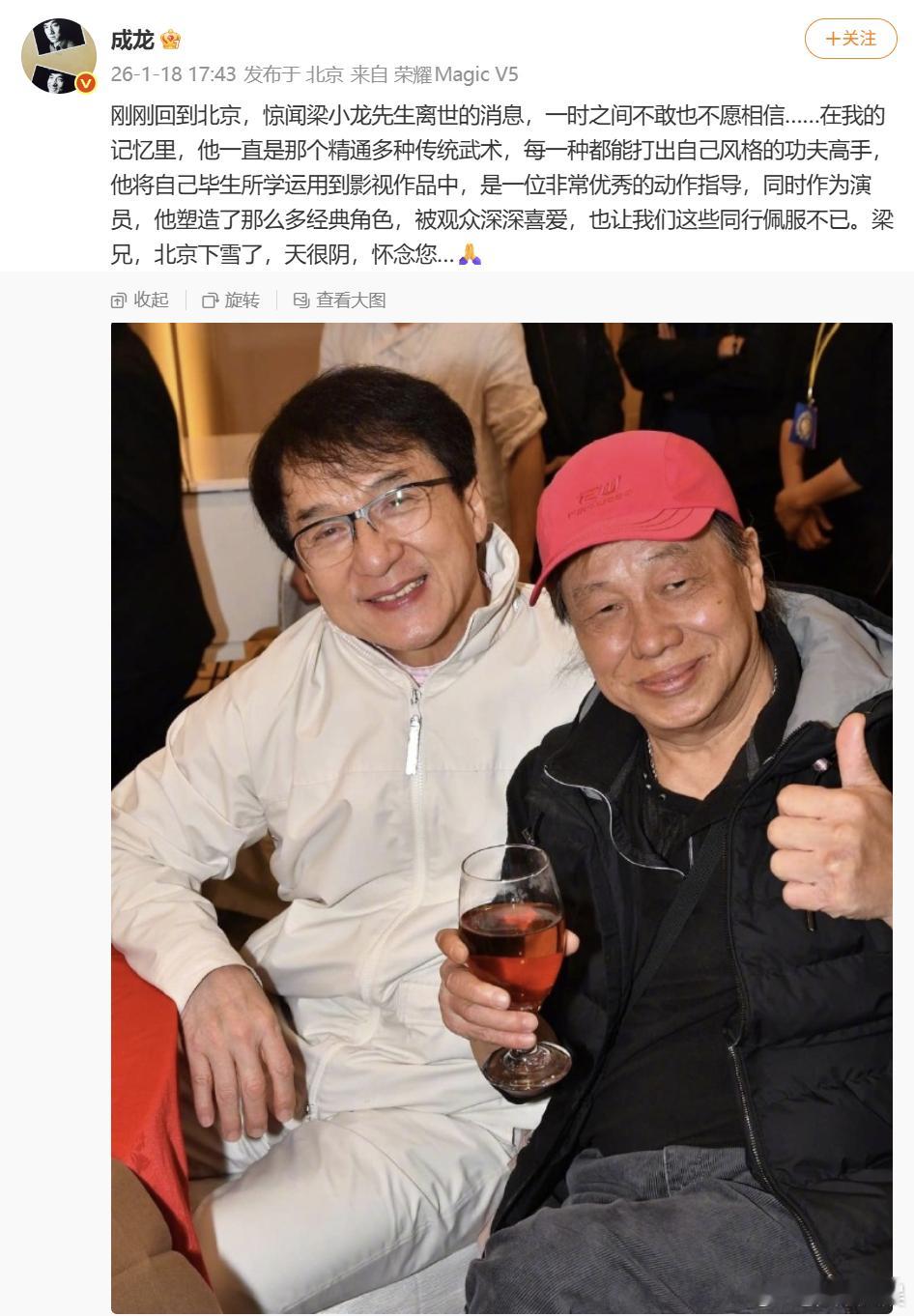 【梁小龙去世】成龙悼念梁小龙据港媒18日报道,著名功夫影星梁小龙,已于1月14日不幸逝世,终年77岁。香港《星岛头条》称,目前梁小龙家人正低调处理后事,暂定于1月26日在深圳龙岗举行出殡仪式。发文悼念梁小龙:刚刚回到北京,惊闻梁小龙先生离世的消息,一时之间不敢也不愿相信……在我的记忆里,他一直是那个精通多种传统武术,每一种都能打出自己风格的功夫高手,他将自己毕生所学运用到影视作品中,是一位非常优秀的动作指导,同时作为演员,他塑造了那么多经典角色,被观众深深喜爱,也让我们这些同行佩服不已。梁兄,北京下雪了,天很阴,怀念您…🙏公开资料显示,1948年4月28日梁小龙出生于广东省中山市,成长于香港一个贫寒的家庭,15岁时进入武行,并开始做替身演员。20世纪70年代,梁小龙和李小龙、成龙、狄龙并称为香港演艺圈“四小龙”。80年代梁小龙凭借在《霍元甲》《陈真》中出演陈真一角而走红,并在2004年上映的周星驰电影《功夫》中饰演“火云邪神”,给影迷留下深刻印象。