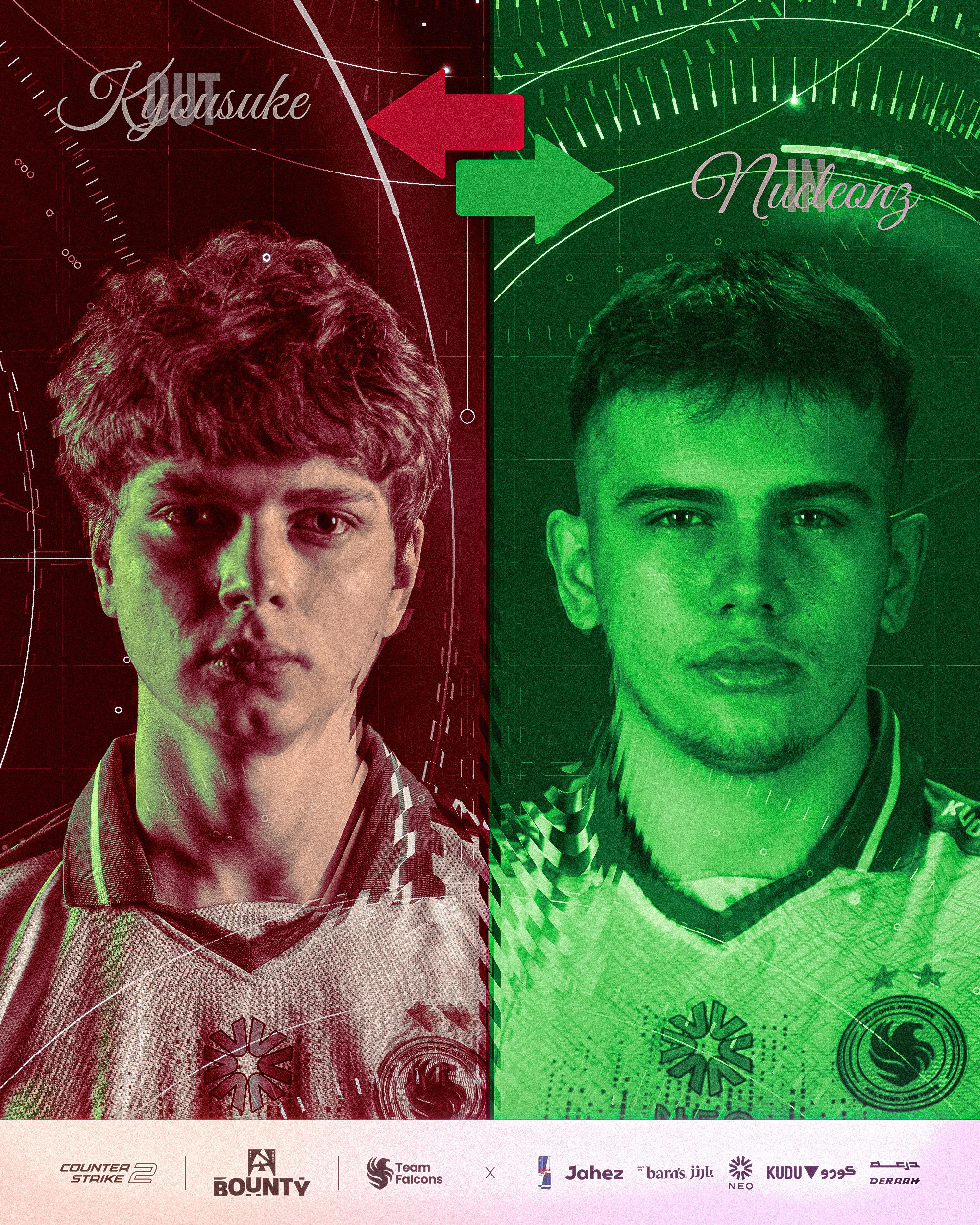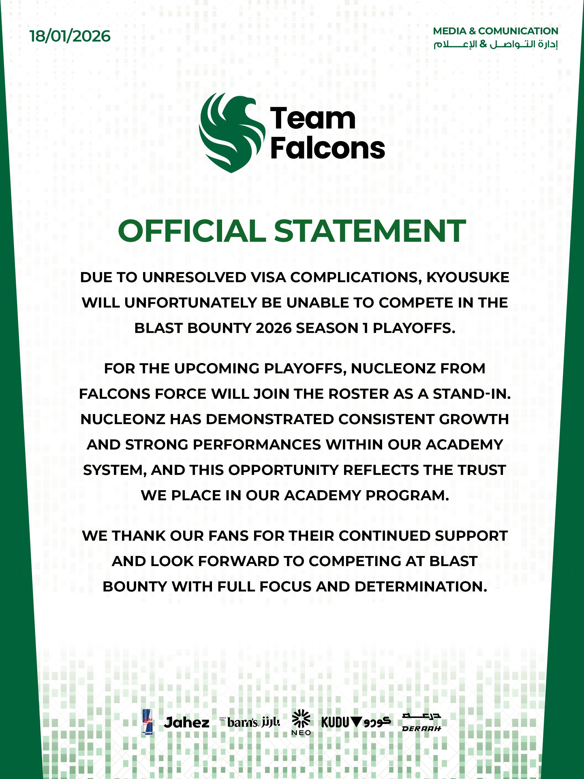 虎扑01月18日讯Falcons官推发布,kyousuke由于签证问题无法参加Blast赏金赛线下赛的比赛,后续将由Nucleonzz代替kyousuke参加比赛