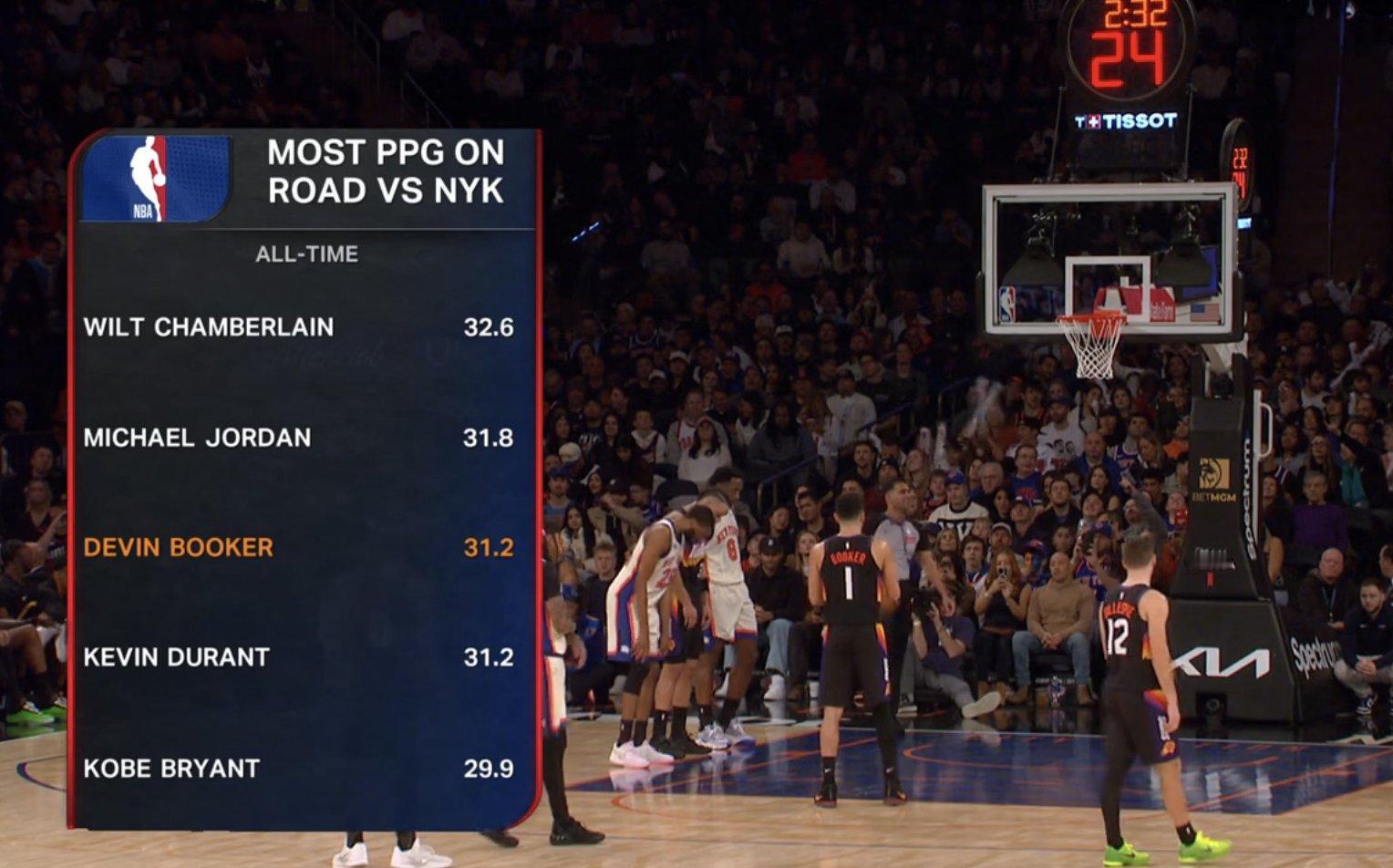 对于能在麦迪逊广场花园打球,布克说:“我总是说,当我看到有些年轻球员来到这里,却完全不在意这座球馆的意义时,我会觉得他们不是真正的篮球人。更不用说今晚还有这么多尼克斯的名宿在场,一大堆的传奇人物都在球馆里。你必须能感受到这一点,兄弟。这就是一切的意义所在。很多那样的前辈为我们铺好了路,才让联盟有了今天的样子。你得表达尊重和热爱。”客队球员在麦迪逊广场花园场均得分榜,布克仅次于张伯伦的32.6分和乔丹的31.8分,和杜兰特一起并列第三。太阳战胜尼克斯太阳vs尼克斯