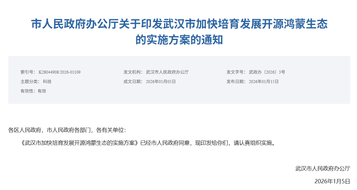 武汉发布开源鸿蒙生态发展方案目标到2027年落地100个示范场景,打造4款行业级系统,适配50款终端设备,培育10万开发者,助力打造千亿级物联网产业