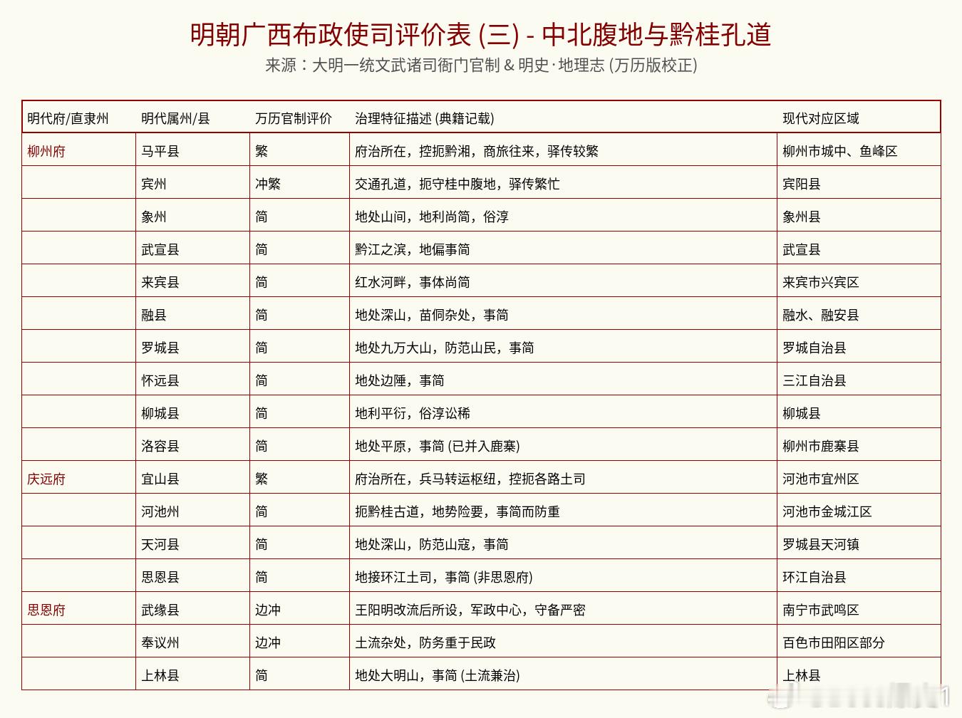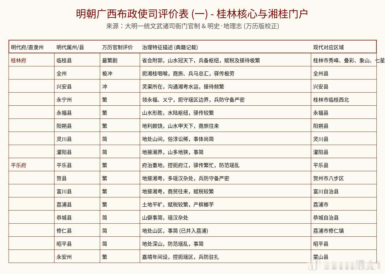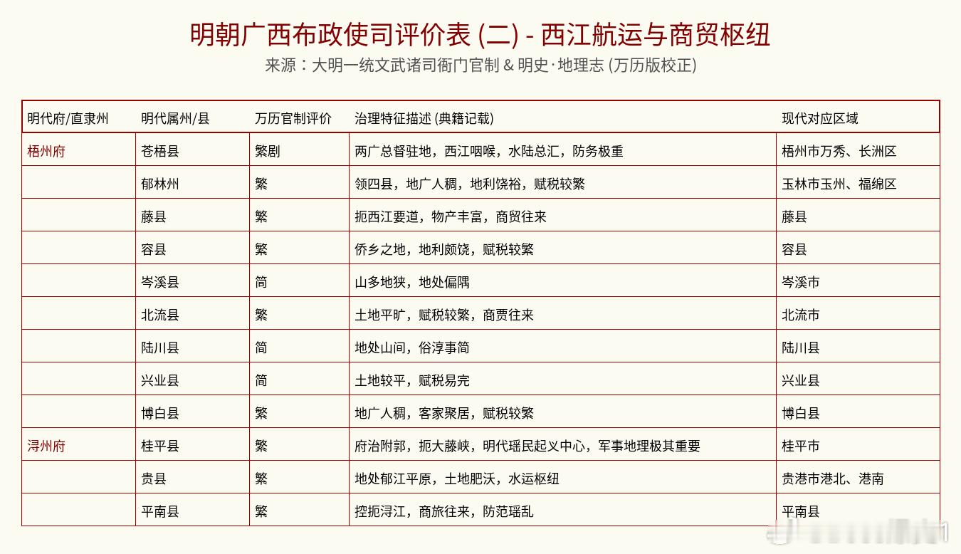 这份关于明朝广西布政使司(相当于现在的广西全境)的官方“考评手册”,摘录自嘉靖、万历年间的官方典籍。在明代,广西被视为“百粤要冲”,既有山水甲天下的繁华,也有苗瑶杂处的治理难度。这份评价不仅揭示了各地的行政地位,也写满了基层官员面对复杂边防和族群事务的真实心声。🏢 顶级内卷中心:桂林(临桂)、梧州(苍梧) 评价直接封神:“最繁剧”!桂林(临桂县):省会首邑,山水甲天下,也是兵家枢纽。接待任务多到手软,还要管全省行政。梧州(苍梧县):两广总督驻扎地,西江咽喉。不仅是贸易中心,更是军事重镇,忙碌程度五颗星。⚔️ 硬核边防前线:南宁、龙州、凭祥 如果你喜欢挑战“生存模式”,请看这里:龙州/凭祥:评价是“极冲”。这可是大明的南大门,“边防重地,守备第一”,这里的官员都是带着刀办公的。南宁(宣化县):府治重地,控扼邕江,防范边乱。这里的行政带有一种铁血的肃穆感。💰 隐形的商贸大佬:浔州(桂平)、柳州(马平)桂平县:扼守大藤峡,明代瑶民起义中心,军事地理极重要,商旅往来也多。马平县(柳州):控扼黔湘,商贸往来极其频繁。虽然忙,但这种“冲”是带着财气的忙。🍃 这种地方最清闲:灵川、灌阳、安仁 关键词:“简”。 像灵川评价是“地处山间,俗淳讼稀”;灌阳评价是“地多地狭,事简”。如果你想在大明找个地方“躺平”躲清静,选这些地方准没错。互动一下: 各位广西老乡,你家当年是负责“搞钱”还是负责“看大门”?评论区聊聊!