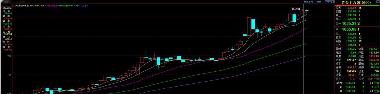 国内黄金主力连续合约, 当周开盘价1004.48元/克, 最高1042.94元/克, 最低价1003.38元/克, 收盘价1032.32元/克, 上涨25.84元/克,涨幅2.57%。 对于不断飙升的国内黄金期货, 期货小褚认为关注1050压力情况!
