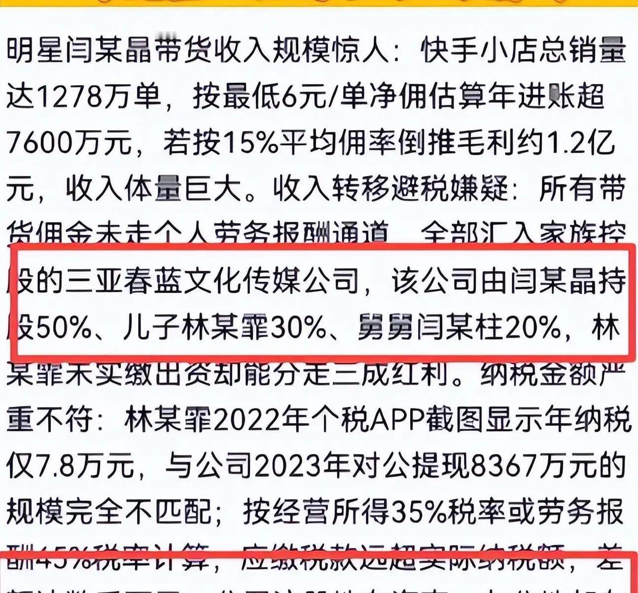 闫学晶最近在三亚机场被拍到,双手叉腰站那儿,神情挺硬气,一点没低头认怂的样子。可这位曾经演农村媳妇深入人心的演员,如今事业和口碑全线崩盘。 事情从去年底她一场直播开始,她说儿子当演员一年才几十万,儿媳挣得更少,在北京过日子一年没百八十万根本转不动。这话一出口,瞬间把普通人气炸了——全国大部分家庭一年收入才几万到十几万,她家这点钱居然还叫苦日子?这不光是哭穷,更像在无意间拉开了明星和老百姓的巨大鸿沟,让人觉得她早忘了自己当初是从农村走出来的。 更麻烦的事接踵而至。有人扒出她儿子林傲霏当年考中央戏剧学院的事,她之前直播里随口说儿子分数低就报了新疆班,结果学校今年1月直接澄清:儿子是北京生源正常考进去的,那年根本没招新疆班。网友不买账,觉得前后说法对不上,教育公平这根弦被绷得死紧。 雪上加霜的是税务问题。打假博主拿出数据,她家快手小店卖了上千万单,算下来收入可能上亿,却通过一家注册在海南、实际在吉林小区办公的公司走账。2023年公司提现八千多万,儿子作为股东个税才缴七万多,这差距大到离谱。税务部门已收到实名举报,区块链固化的证据链摆在那,查实了补税罚款都是轻的,严重可能涉及刑事责任。 现在她的账号被多平台禁止关注,代言品牌全跑路,损失上千万,辽宁春晚小品也直接换人。曾经靠接地气形象吃饭的她,现在却因为几句话把自己推到悬崖边。 人不能飘得太高,忘了根也忘了规矩。赚得多是本事,但怎么赚、怎么说,都得对得起养活你的观众和这个社会。闫学晶这回的教训够深刻:脱离群众迟早要付出代价