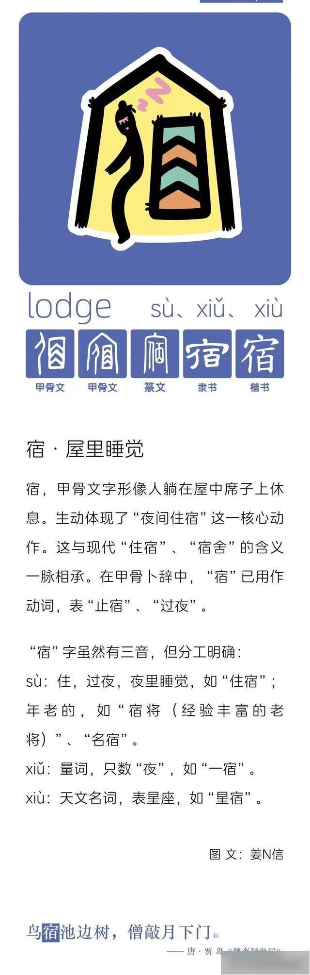 sù:住,过夜,夜里睡觉,如“住宿”;年老的,如“宿将(经验丰富的老将)”、“名宿”。