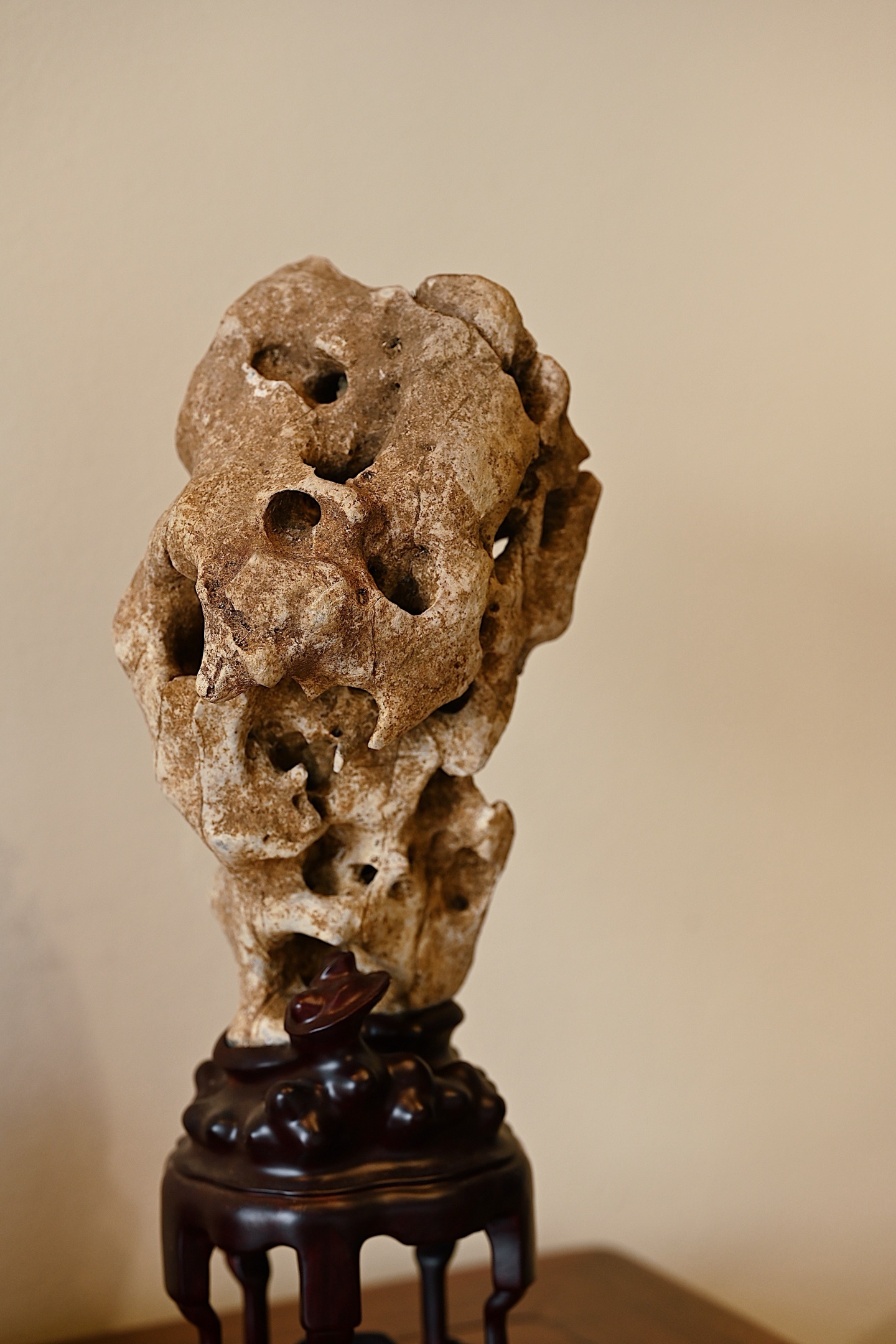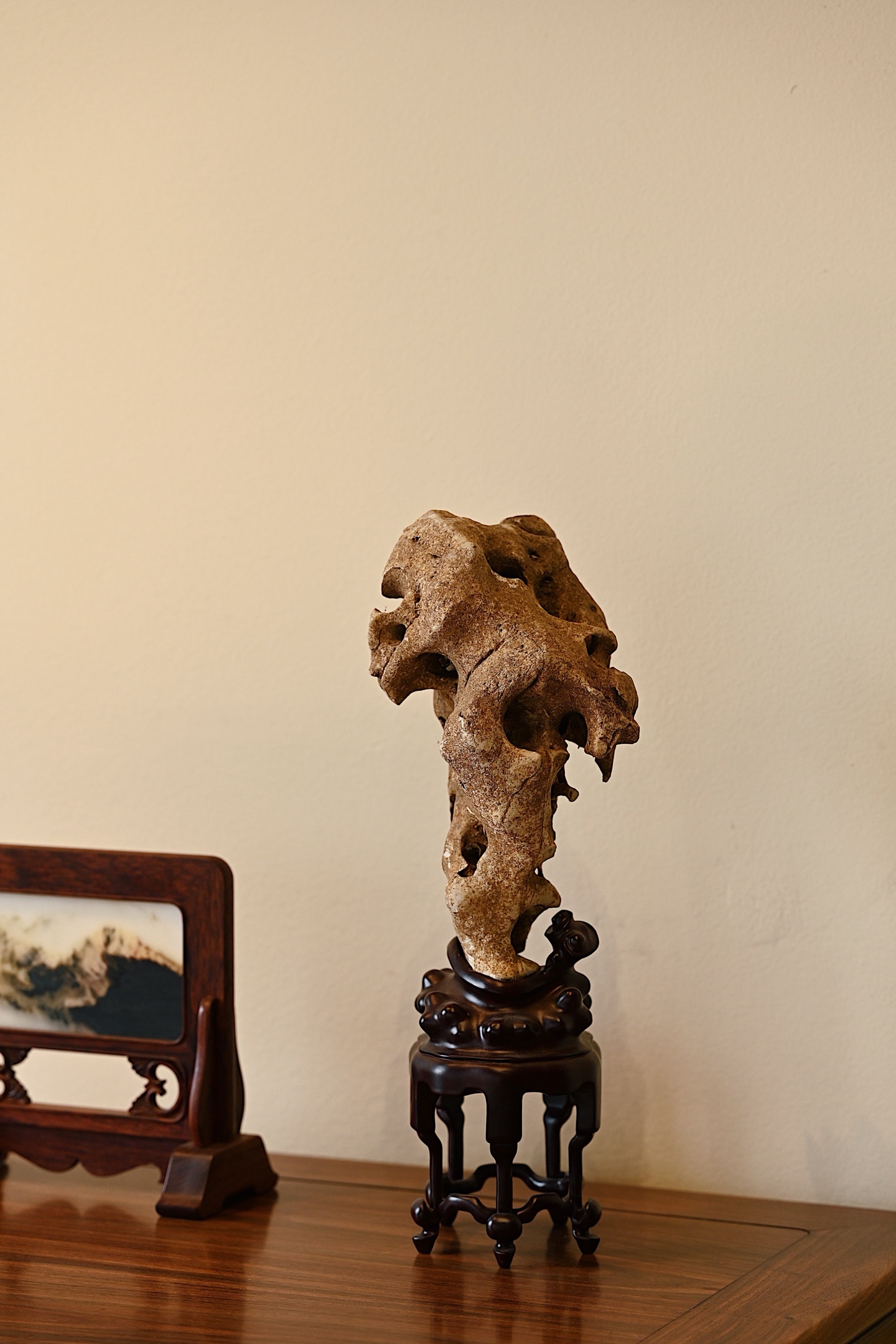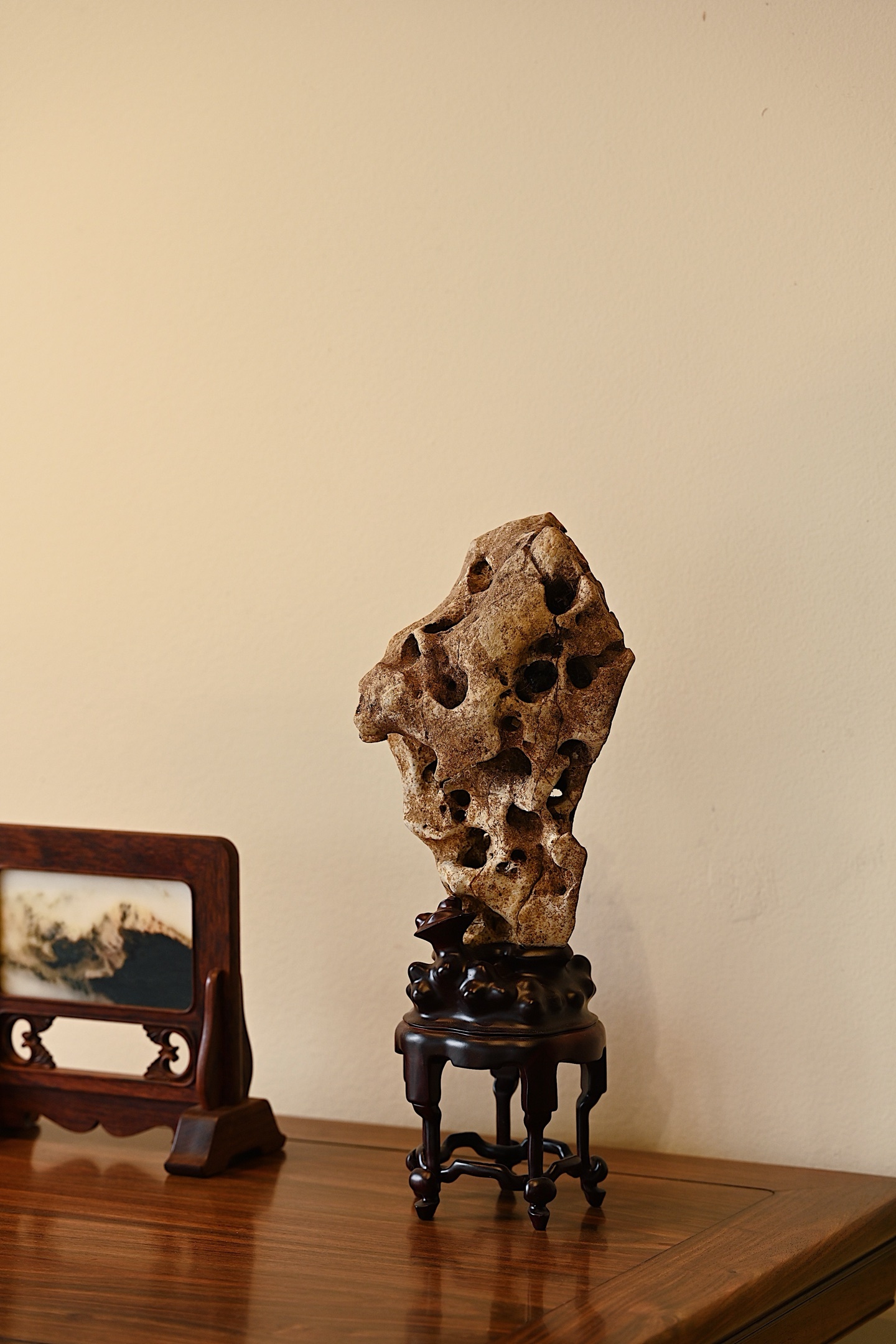 太湖石 | 镂云造型玲珑,表面遍布不规则的块状凸隆,内有洞穴,若云涡萦回,迂回曲折,形奇纹美,圆融灵动,观之神思悠远。14*13*36cm 2568g
