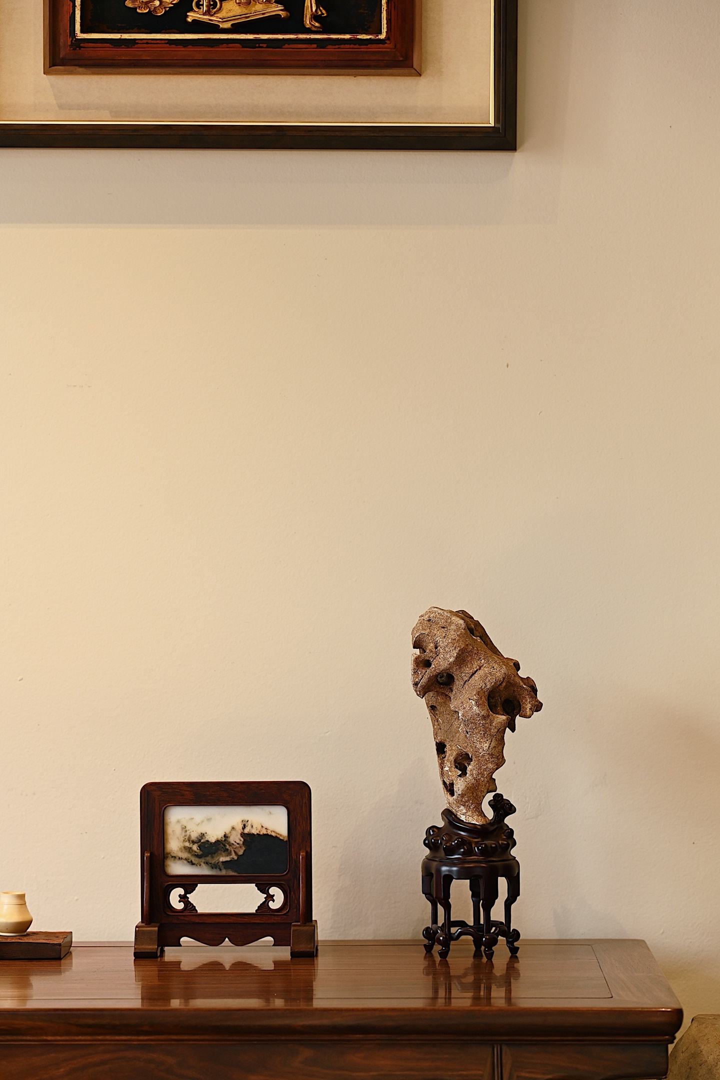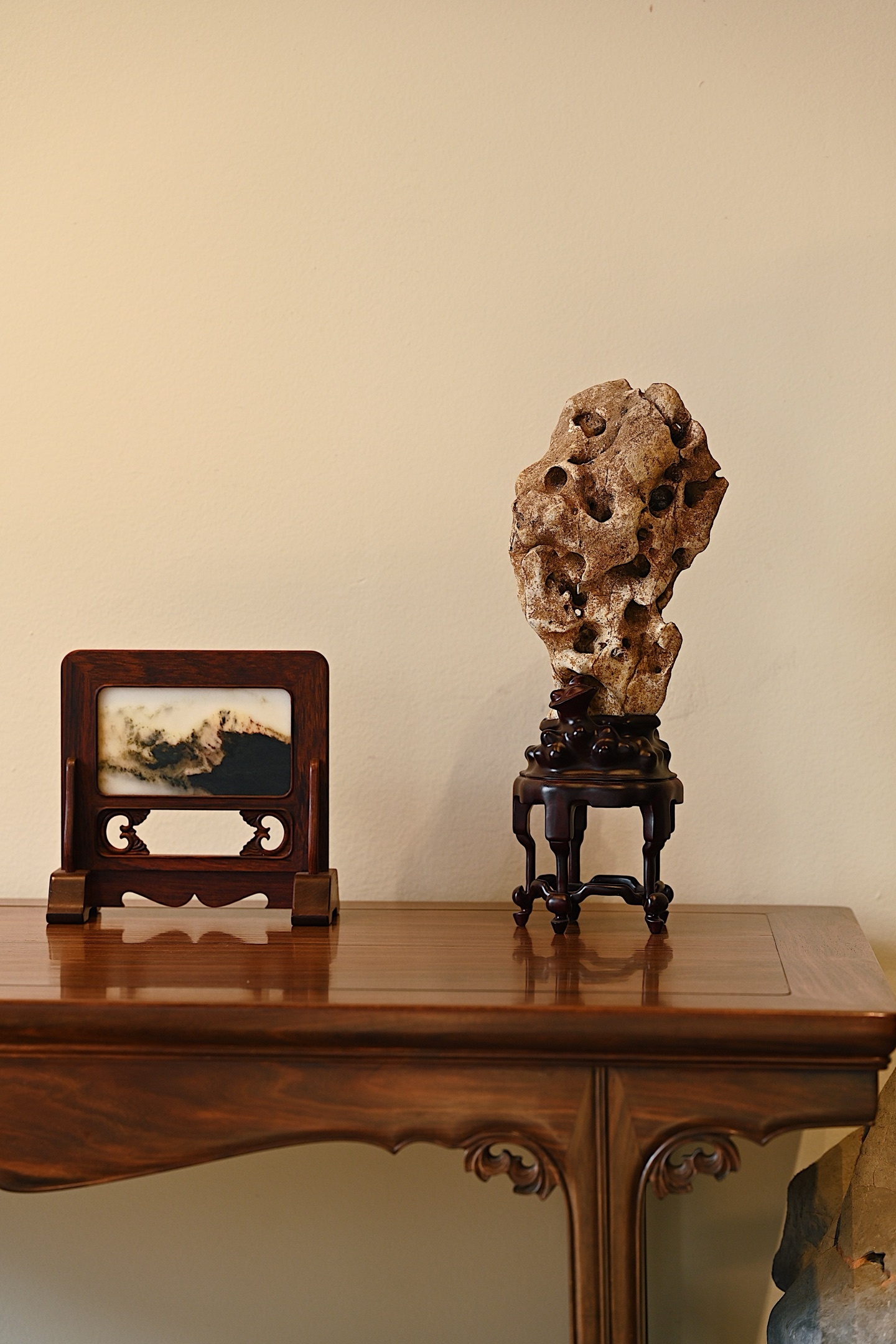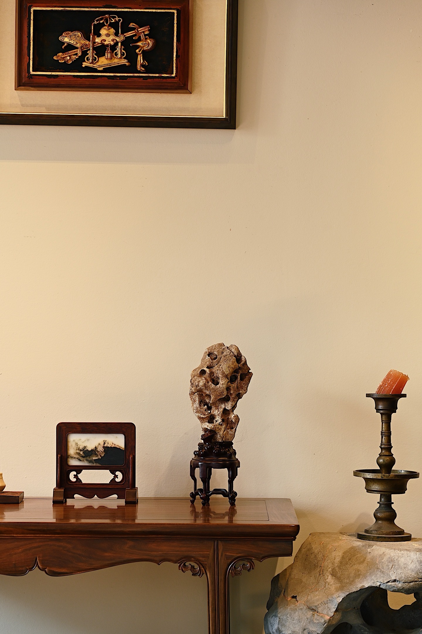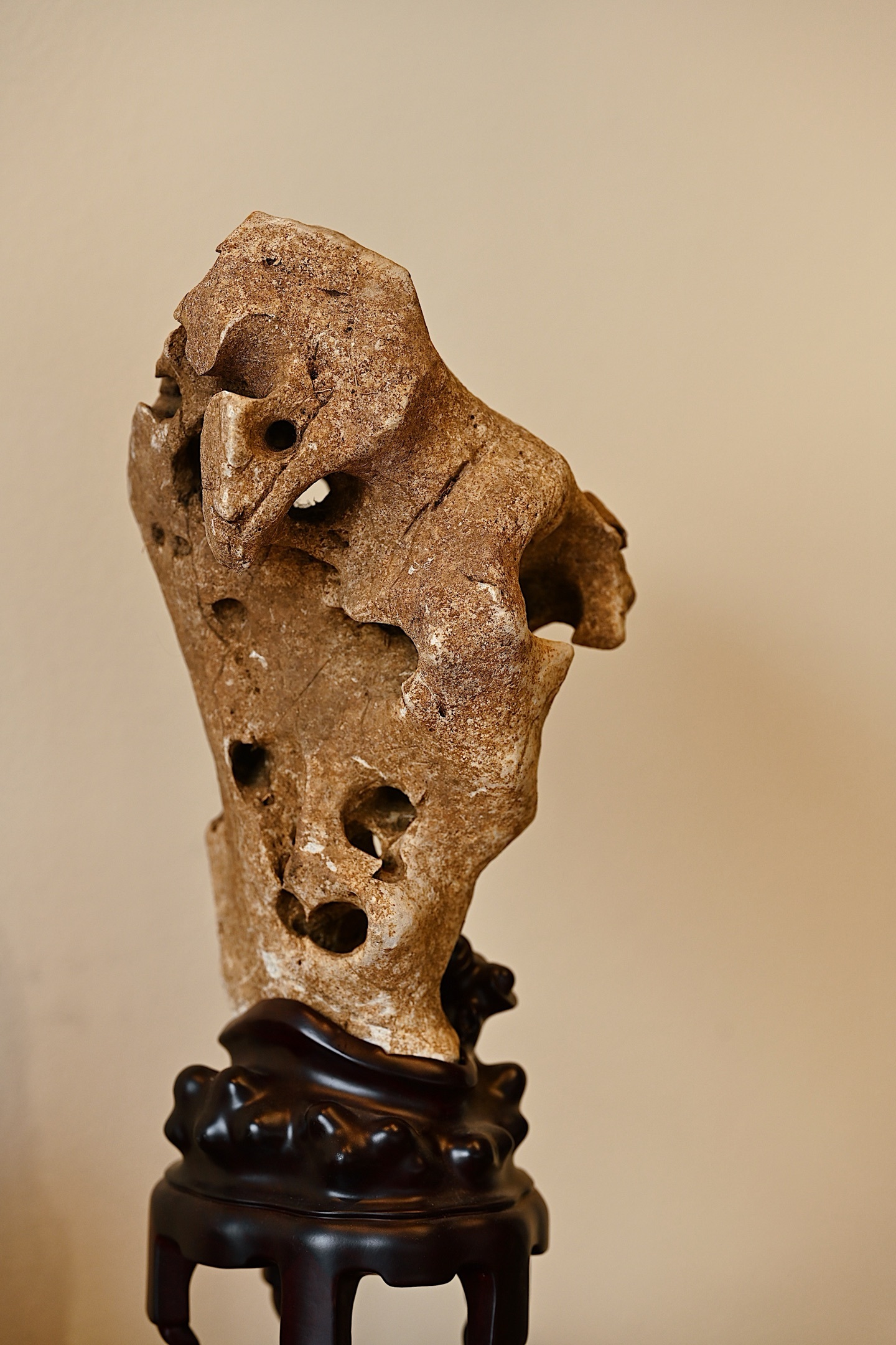 太湖石 | 镂云造型玲珑,表面遍布不规则的块状凸隆,内有洞穴,若云涡萦回,迂回曲折,形奇纹美,圆融灵动,观之神思悠远。14*13*36cm 2568g