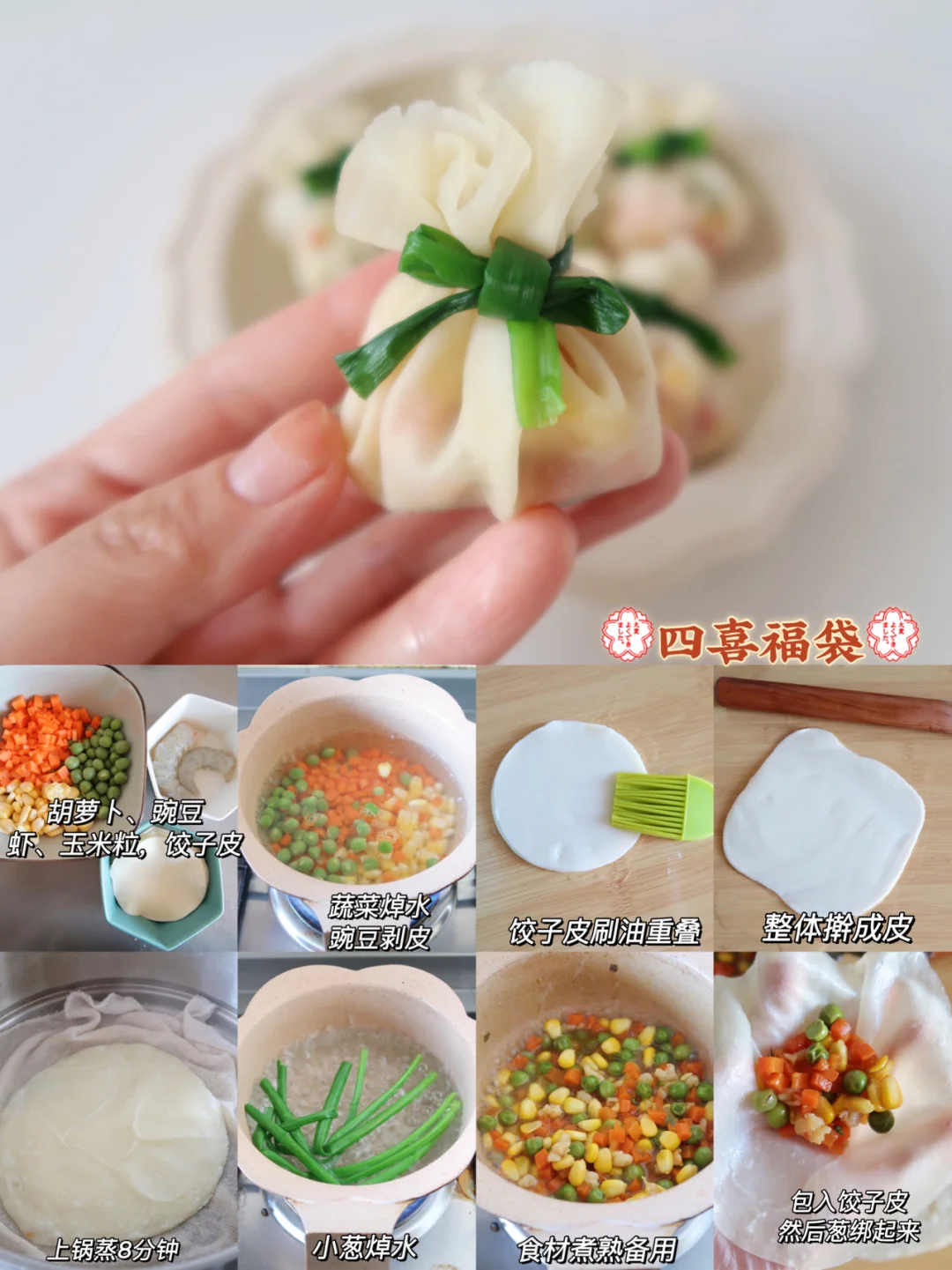 步骤:蔬菜焯水,豌豆剥皮,饺子皮刷油然后重叠起来再擀成面皮手掌大,然后上锅蒸8分钟,蔬菜丁和虾煮熟,小葱焯水,把煮熟的虾仁蔬菜放入饺子皮里,然后绑起来就可以啦,很简单