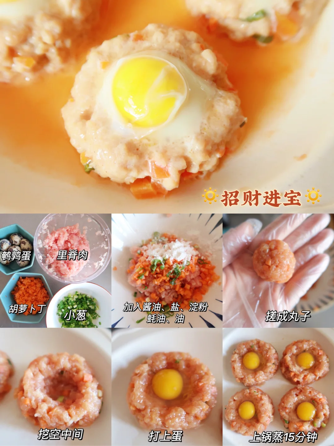 步骤:所有材料混合加入盐、酱油、蚝油、淀粉搅拌至手累即可哈哈哈,然后搓成圆球,中间按压空倒入鹌鹑蛋,然后上锅蒸15分钟即可
