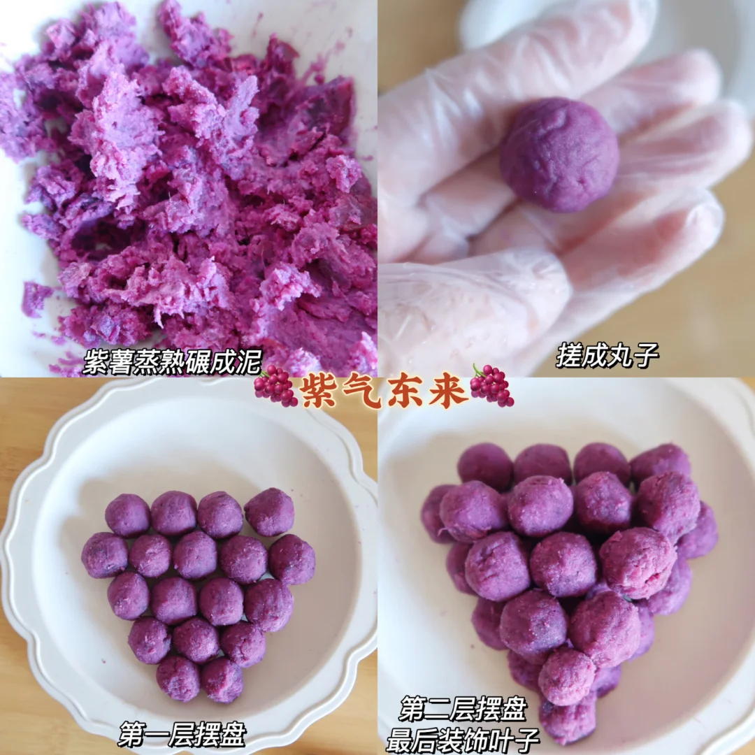 紫薯蒸熟加入牛奶或者放点糖碾成泥,然后搓成丸子状,摆盘起来就可以啦,叶子部份可以放绿色青菜,或者家里有的绿色叶子都很好看哦这个小宝宝也可以吃,所以我没有刷油也没有放蜂蜜,蜂蜜适合3岁以上