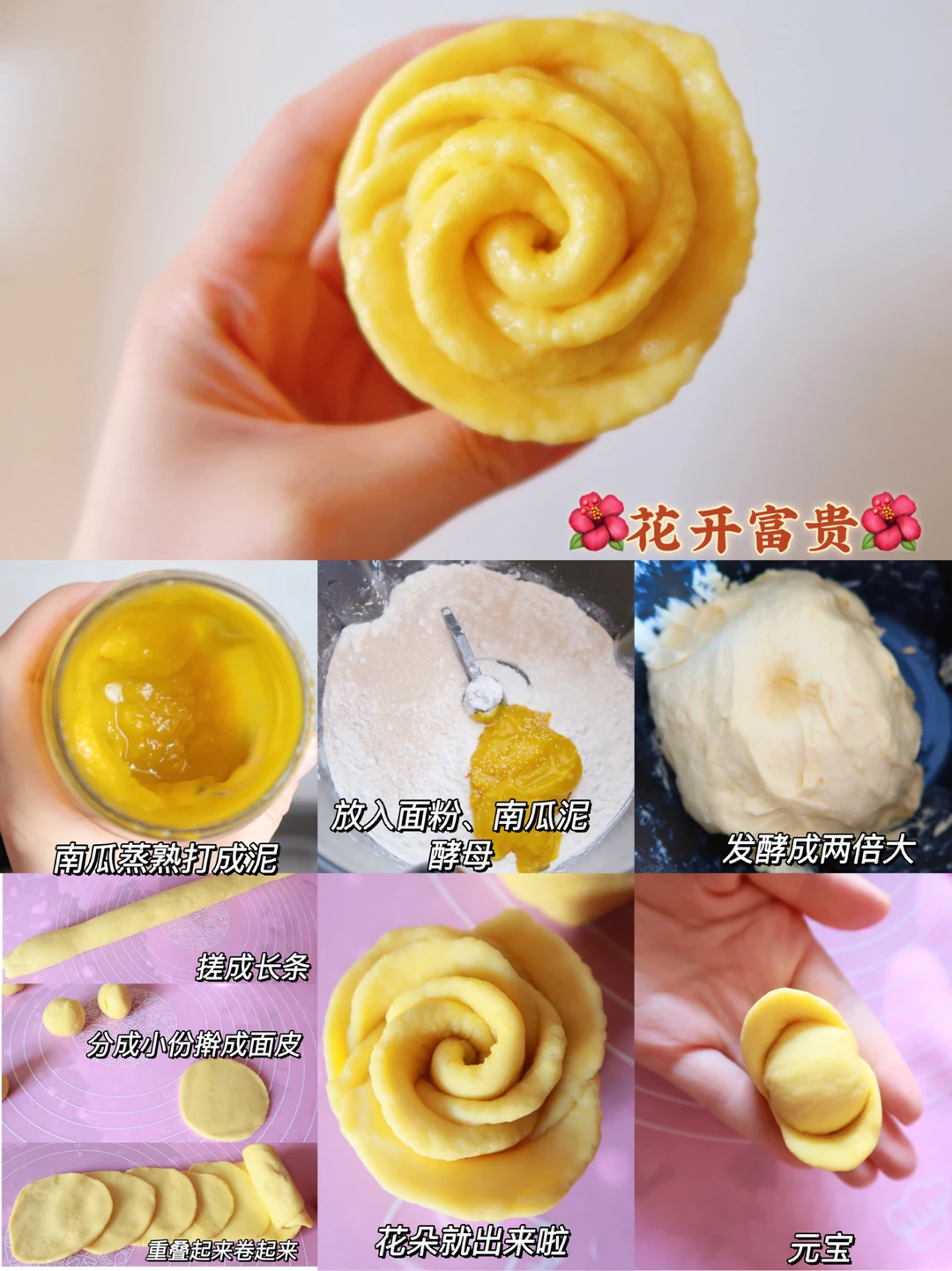 步骤:南瓜蒸熟打成泥,加入面粉酵母揉成面团,然后发酵至两倍大,然后搓成长条,分成若干份,搓成圆球擀成面皮,重叠起来卷起来就可以啦,我还做了几个元宝,上锅蒸15分钟就可以啦