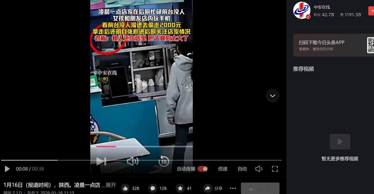 胆子也太大了吧!陕西,凌晨一点,一女孩和朋友去到一家餐馆内玩手机,不料女孩趁店家在后厨忙碌前台没人时,竟偷偷溜到收银台偷走了店家2000元现金。更让人没想到的是,当女孩得手后,不但不慌不忙坐回座位和朋友分享,后还明目张胆的进后厨观察店家情况,见店家没有发现,女孩更是得意的和朋友感到窃喜。 事情发生在陕西一座城市的深夜,时针指向一点时,大部分店铺早已关门歇业,只有这家餐馆还亮着灯,老板守在店里收拾,偶尔接待几个晚归的食客,就在这时两个年轻女孩推开了店门,她们穿着整洁,看着和普通年轻人没两样,进来后找了个角落的位置坐下,全程低着头玩手机,神态十分放松。 老板见多了晚归蹭座位的年轻人,也没多想,只当是两位姑娘累了歇脚,没一会儿就转身进了后厨,忙着清洗餐具、整理食材,他万万没想到,自己这一转身,就给了有心人可乘之机,更没料到,这个看起来人畜无害的女孩,胆子会大到这种地步。 后厨的动静不大,前厅暂时没人看管,监控里清晰地显示,其中一个女孩像是早就盯准了时机,见老板进了后厨,立刻停下玩手机的动作,起身朝着收银台走去,她的姿态自然得不像话,既没有东张西望的慌张,也没有偷偷摸摸的躲闪,大摇大摆地就走到了钱箱旁,仿佛那是自家的抽屉。 短短几秒她就伸手从钱箱里抽走了一沓现金,仔细数下来足有2000元,按理说小偷得手后都会急着跑路,可这个女孩偏不,她把钱快速塞进衣兜,还下意识整理了一下衣角,确保看不出异样,随后慢悠悠地走回原位,坐下来继续和同伴凑在一起。 两人头挨着头低声说着什么,监控画面里能隐约看到她们脸上的笑意,那是一种得手后的窃喜,完全没有半分愧疚和紧张,这还不算完更离谱的操作还在后面,女孩居然起身走到后厨门口,装作漫不经心的样子探头探脑,眼神时不时瞟向老板,明摆着是在观察店家有没有发现钱少了。 当时老板正忙着手里的活,压根没留意到前厅的动静,也没察觉女孩的窥探,见老板毫无异常,女孩放心地缩回身子,走回座位后,和同伴聊得更欢了,脸上的得意藏都藏不住,仿佛刚才偷钱的举动,只是完成了一件微不足道的小事。 等老板从后厨出来,准备清点当晚营收结账时,一打开钱箱就发现不对劲,里面少了整整2000元,这对于一家小本经营的餐馆来说,可不是小数目相当于起早贪黑忙活好几天的收入。老板又急又气,立刻调出店内监控,当看到画面里女孩的一系列操作时,当场就气炸了。 他实在想不通两个姑娘穿着打扮都挺体面,看着也不像缺钱的人,怎么就敢在店家还在店里的时候,光明正大地偷钱?更让他寒心的是,这女孩偷完钱不仅不跑,还敢主动去后厨门口观察,这份胆子和心理素质,实在超出了常人的理解。 监控视频被发到网上后,很快引发了网友热议,大家清一色都在说女孩胆子太大,有网友留言:“就算是惯犯,也很少有人敢在店主还在店内的时候下手,得手后还不跑路,居然还敢打探情况,这简直是明火执仗。”还有人吐槽:“看着干干净净的姑娘,心思怎么这么歪,2000元钱,毁了自己的名声,太不值当了。” 有人猜测女孩可能是为了寻求刺激,才做出这种荒唐事,也有人觉得她说不定是惯犯,早就摸清了小餐馆的经营规律,才敢这么肆无忌惮。 但不管原因是什么,偷钱本身就是违法行为,她那副得意洋洋的样子,更让人难以接受,她显然没意识到自己的所作所为,早已被监控完整记录下来,每一个得意的笑容,都是指控她的证据。 对于小餐馆老板来说,这2000元是辛苦钱,是养家糊口的根本,可对于这个女孩来说,或许只是一次“成功挑战”的快感,却不知道这种侥幸心理只会让她付出更大的代价,法律从不会纵容任何违法行为,再大胆的举动,也逃不过天网的监视,等待她的终将是应有的惩罚。