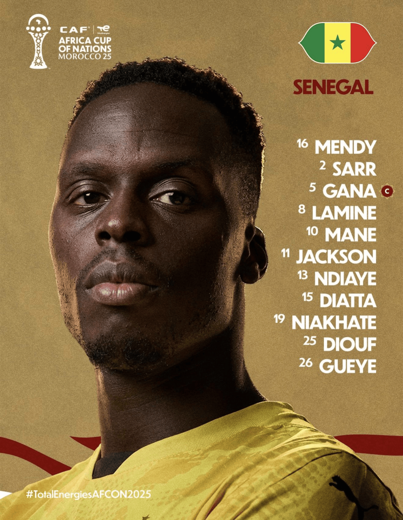塞内加尔首发:16-爱德华-门迪、24-安托万-门迪、2-马马杜-萨尔、19-尼亚凯特、25-哈吉-迪乌夫、8-拉明-卡马拉、5-伊德里萨-盖伊、13-恩迪亚耶(埃弗顿)、26-帕普-盖伊、11-杰克逊、10-马内