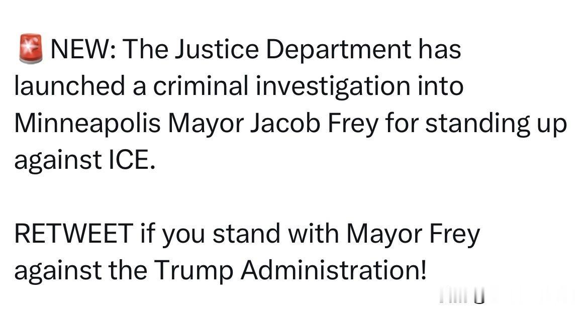 最新消息:美国司法部DOJ已对明尼苏达州的明尼阿波利斯市长杰克博·弗雷/Jacob Frey公开反对移民执法局ICE的执法行为,展开了刑事调查。 背景资料: 美国移民执法局在明尼阿波利斯市开枪射杀了一名女性驾驶员后,在当地掀起了反移民执法局的高潮。