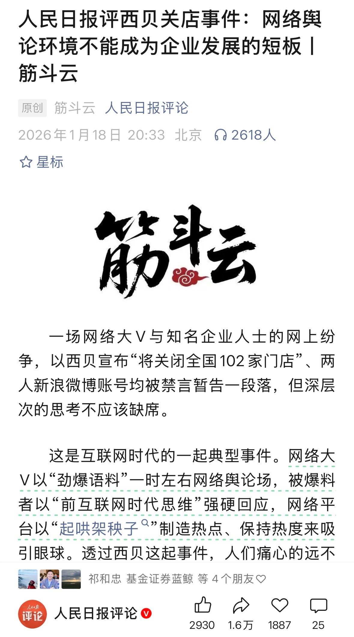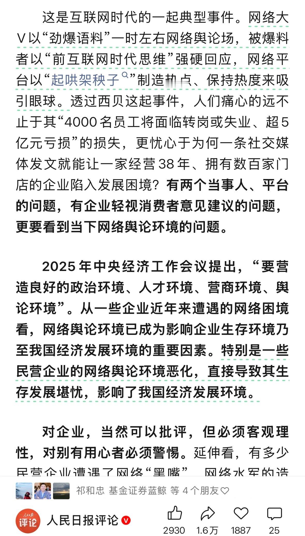 胡锡进谈西贝关店102家 人民日报评论:西贝事件早已超出口水战,罗永浩们、贾国龙们、新浪微博等平台们,都有要汲取教训的地方,“营造清朗的网络空间”绝不是一个虚设的命题,而是各方必须时刻答好的共同答卷,谁违背了这一守则,谁终将受到严厉惩罚。