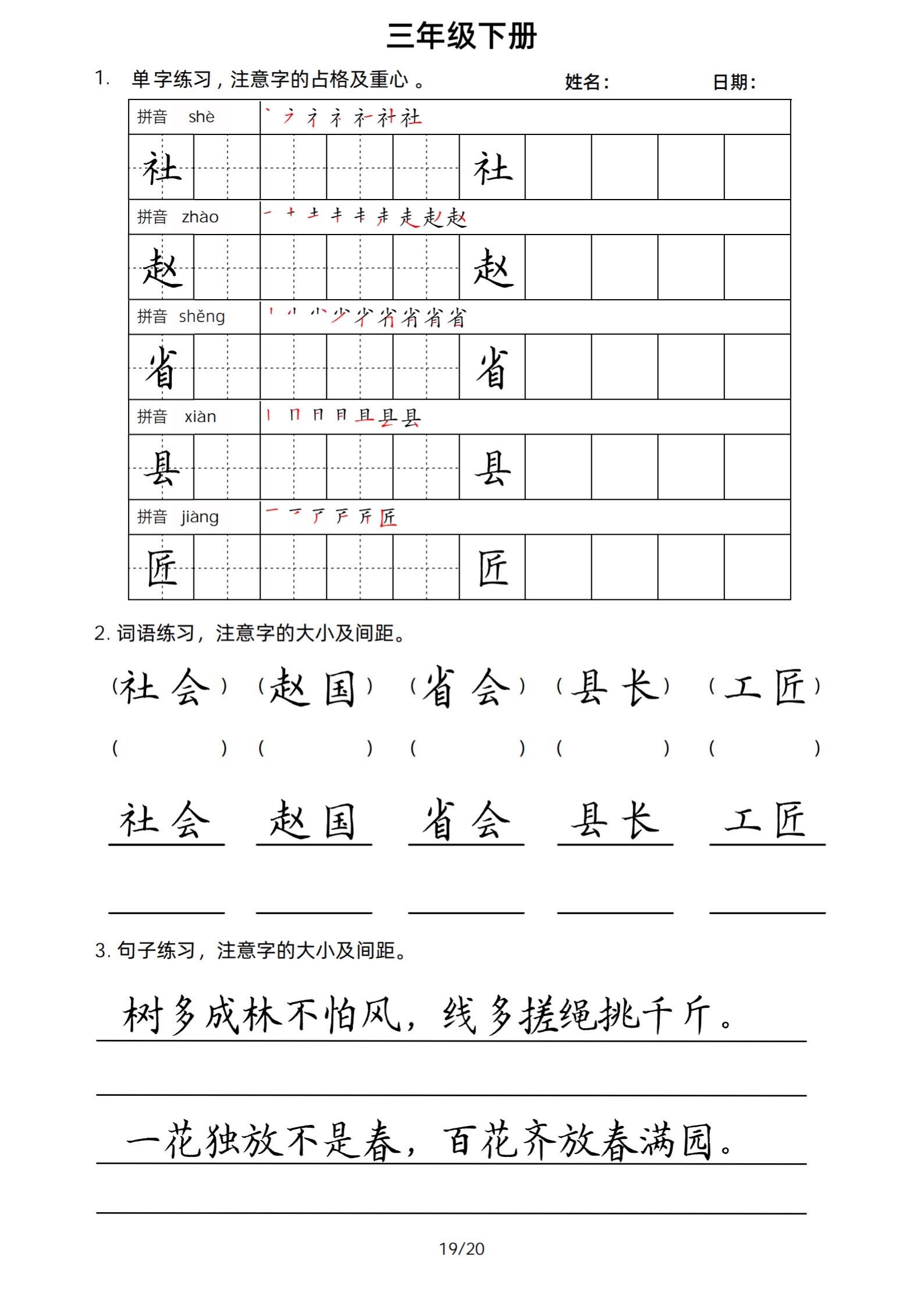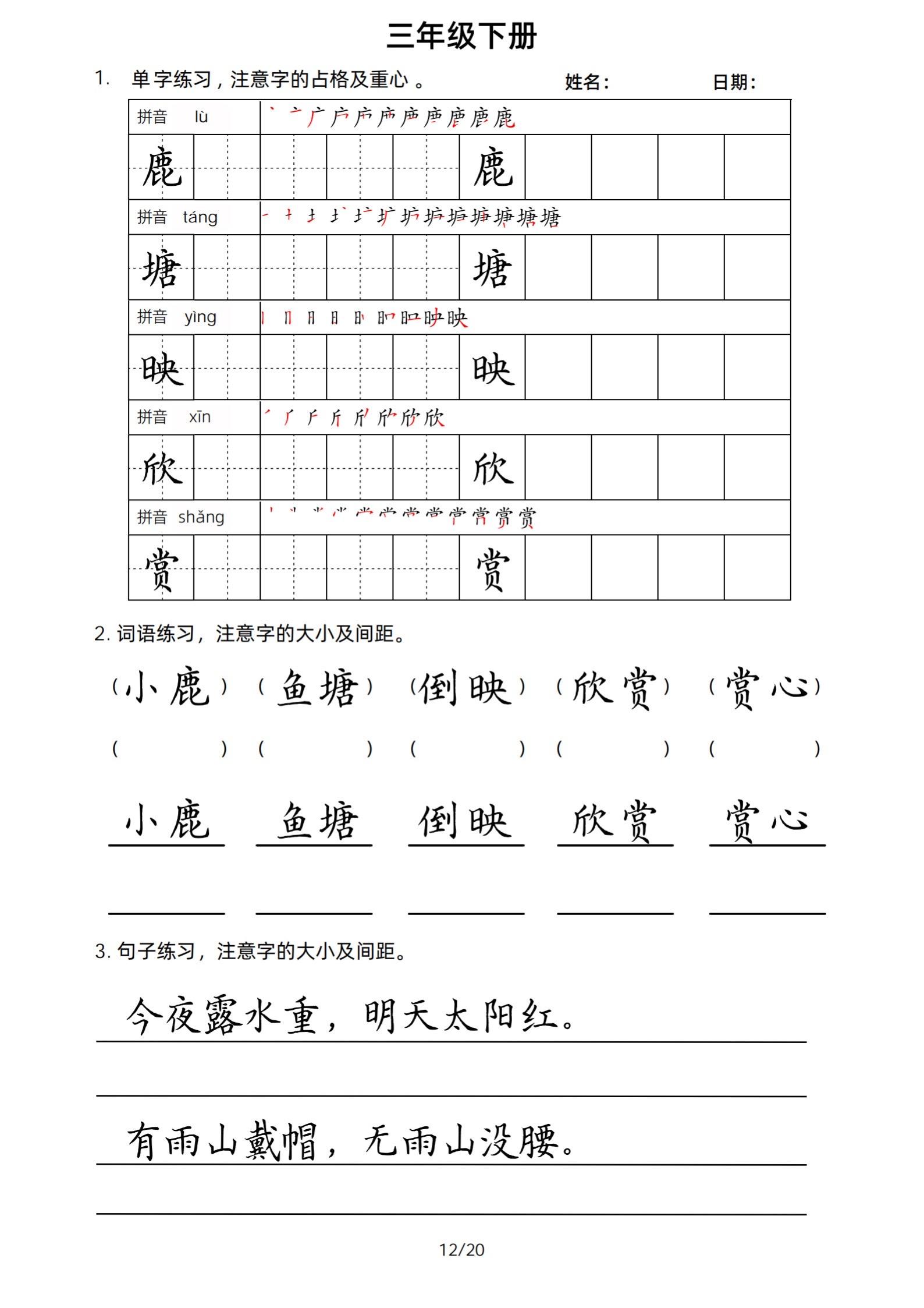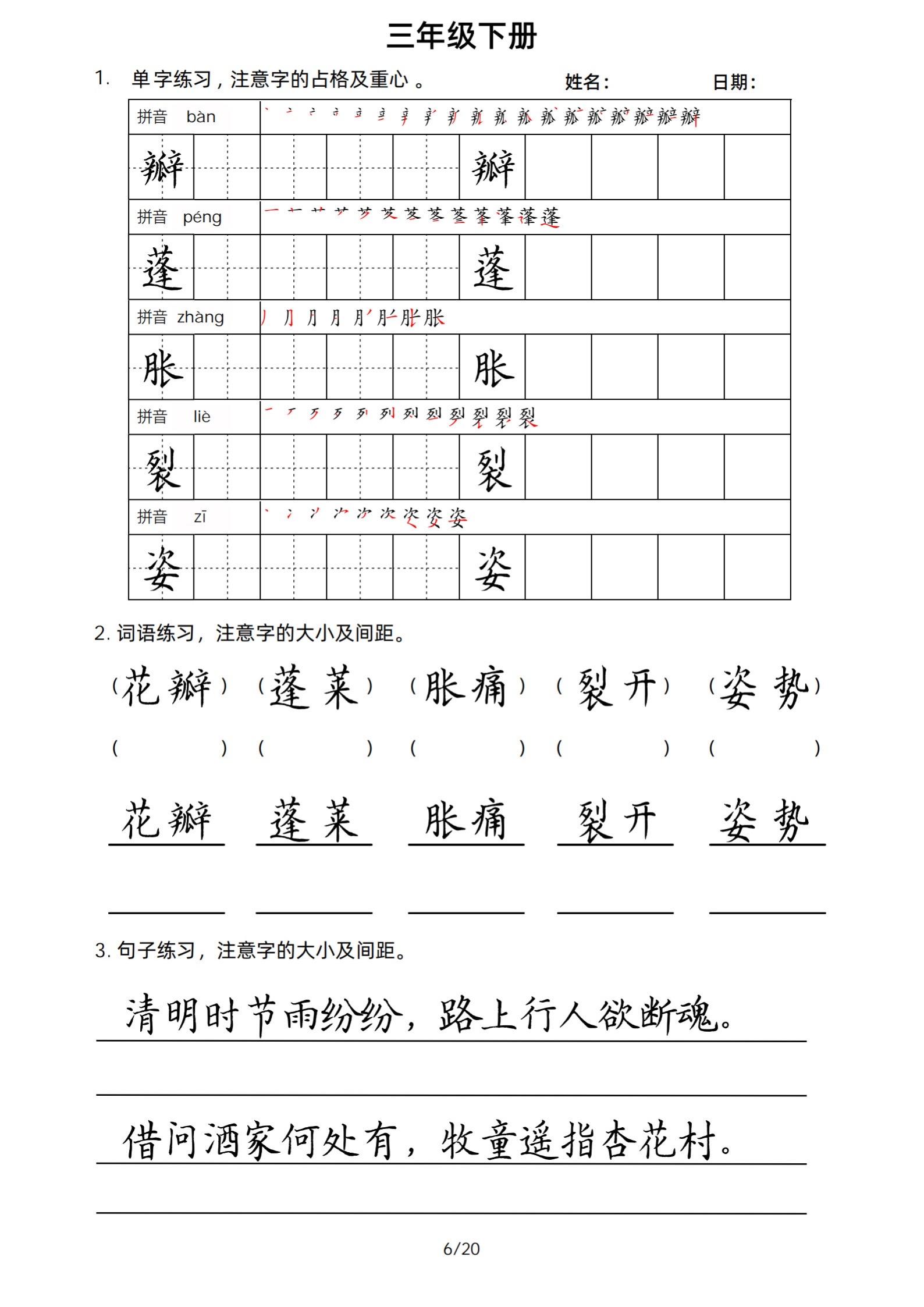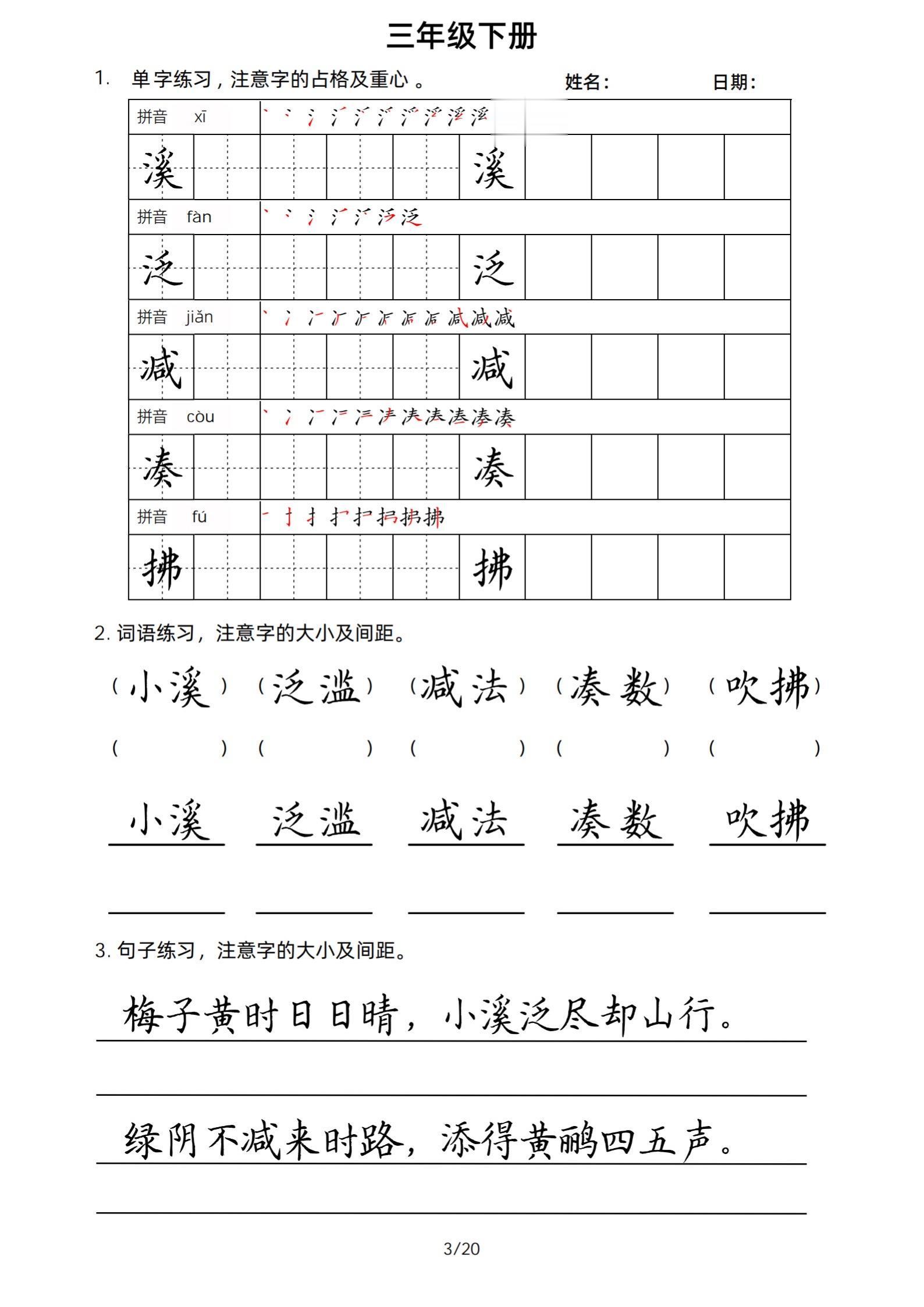 2026年春小学三年级下册生字帖课贴。小学语文 字帖,字音,笔画顺序,组词手写笔记教材 study打卡 永春县最便宜打印店 八方文印店。有需要可以自行下载打印出来