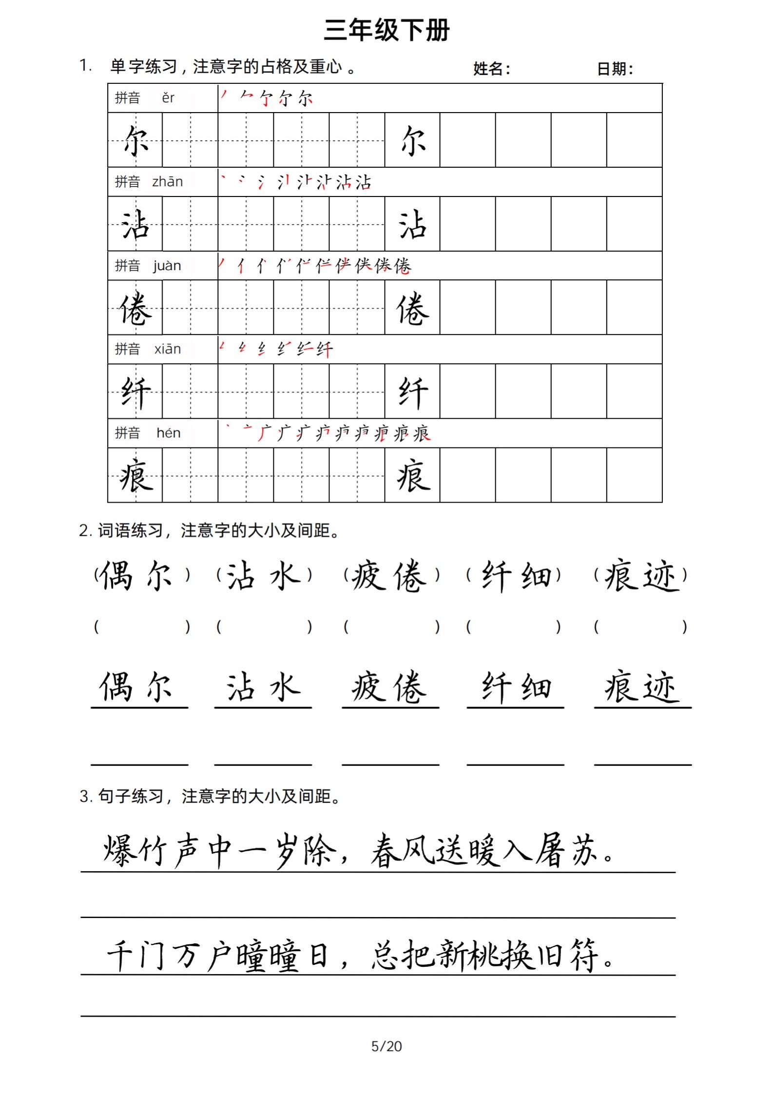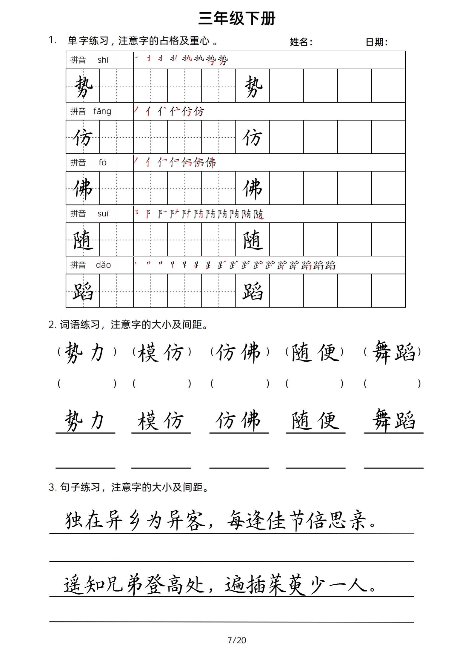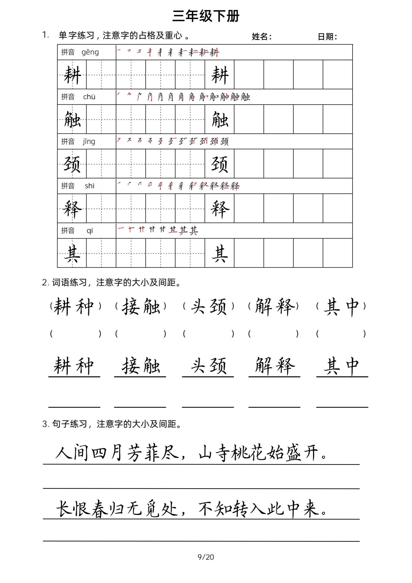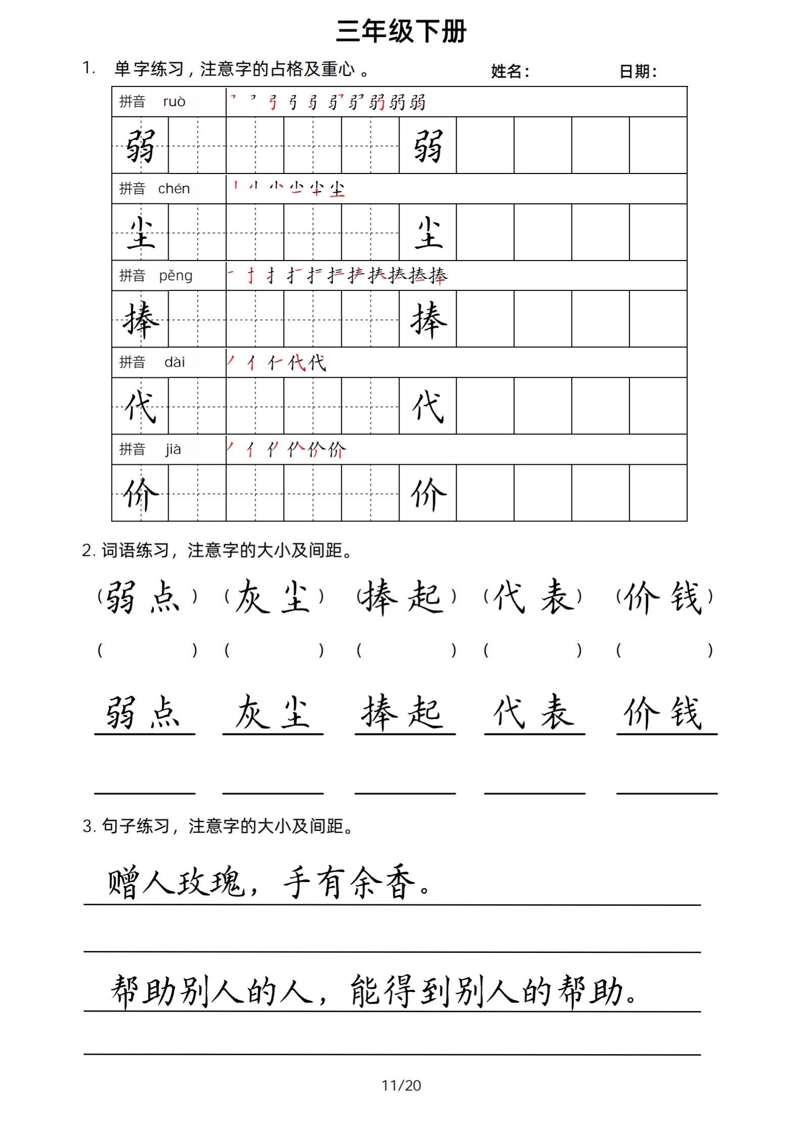 2026年春小学三年级下册生字帖课贴。小学语文 字帖,字音,笔画顺序,组词手写笔记教材 study打卡 永春县最便宜打印店 八方文印店。有需要可以自行下载打印出来